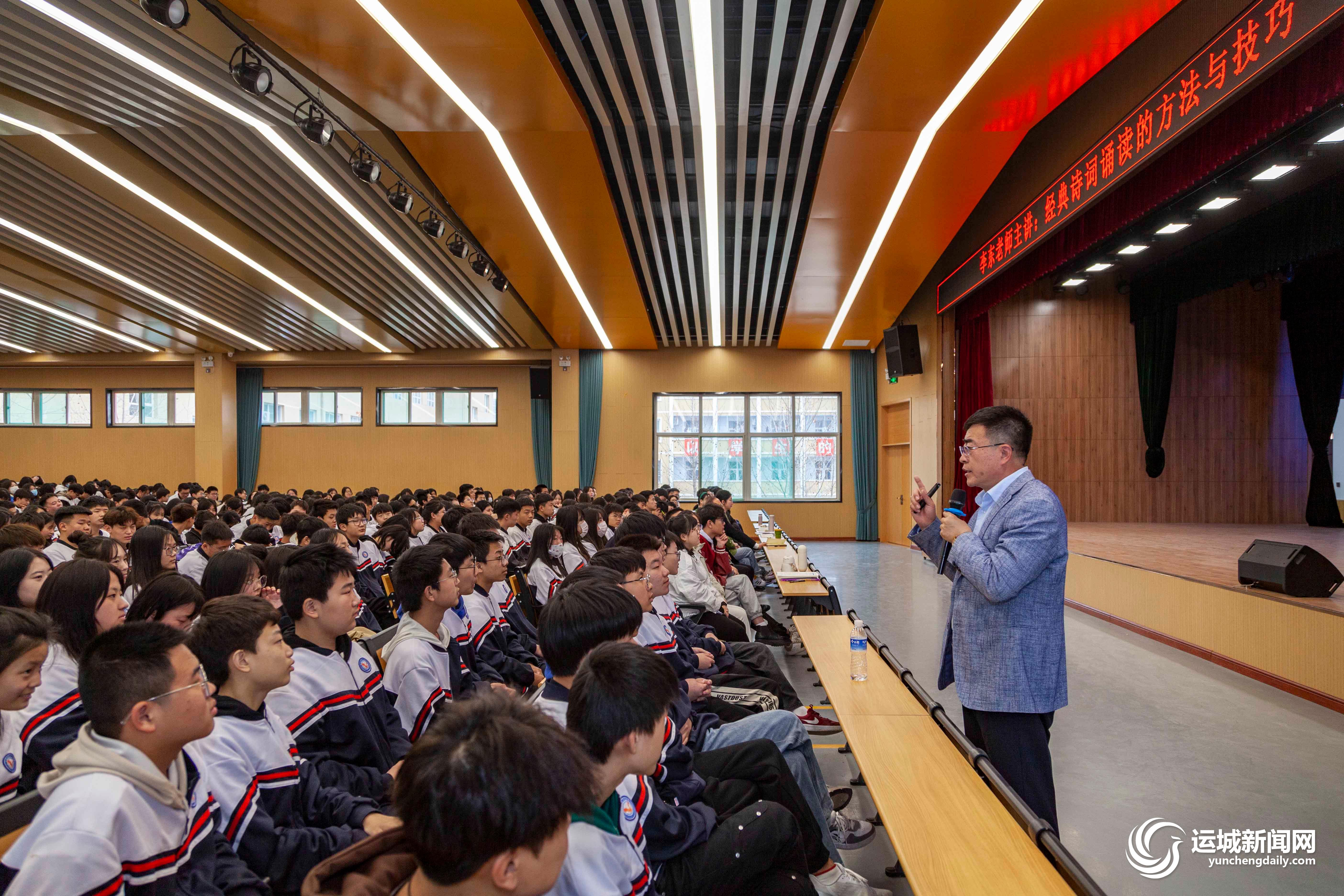 运城晚报讯(记者 茹雅)3月16日,运城市职业技能学校特邀阅读教育专家李东,在该校举办经典诗词朗诵的方法与技巧专题讲座,全校1000余名学生聆听专家讲座(上图)。