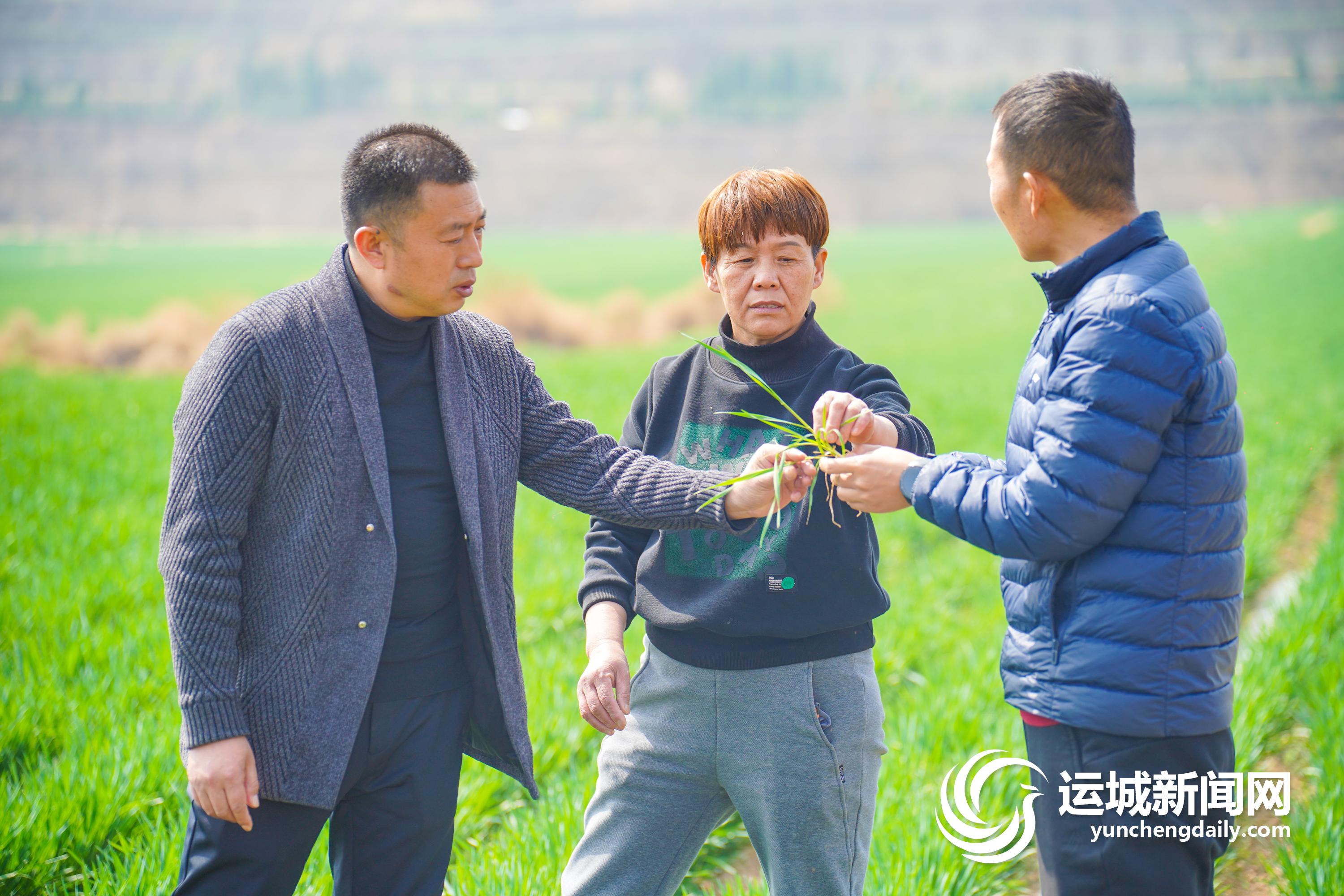 闻喜县农业农村局土壤肥料工作站站长文杰(左一)在麦田里查看小麦长势。 记者 陈方斌 摄