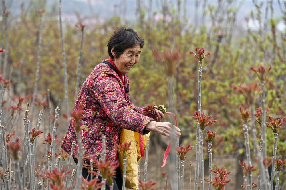 3月23日,永济市韩阳镇竹林村村民在采摘头茬香椿芽。据悉,当地出产的香椿芽,经保鲜保湿后发往北京、西安、太原等地市场。