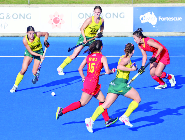 3月25日,中国队球员欧紫霞(右一)在比赛中。 当日,在澳大利亚珀斯举行的女子曲棍球友谊赛中,中国队以2比0战胜澳大利亚队。