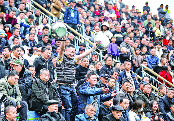 3月26日,一名看台上的观众敲着脸盆加油助威。 当日,贵州省首届“美丽乡村”篮球联赛总决赛在黔东南州台江县台盘村落幕。这项由台盘村“六月六”吃新节篮球赛发展而来的赛事因为火热的现场氛围和“接地气”的办赛风格,在2022年“火爆全网”,被网友亲切地称为“村BA”。 新华社记者 刘续 摄