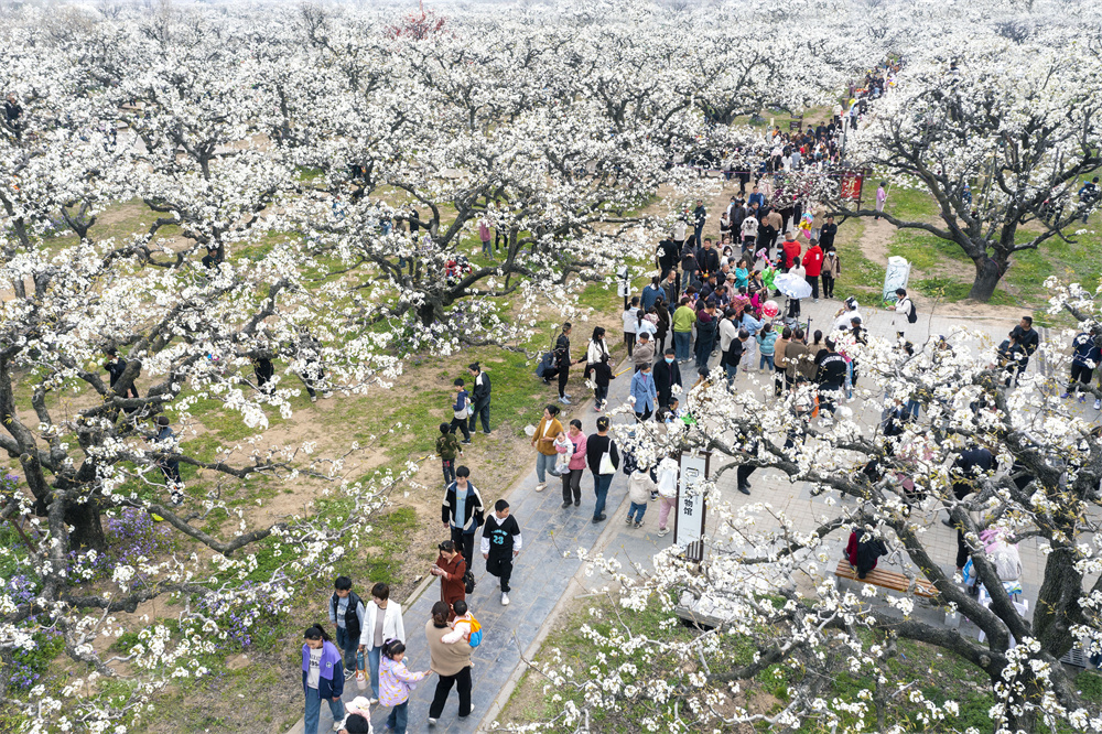 近日,安徽省宿州市砀山县50万亩梨树进入盛花期,丰富多彩的活动在梨园举行,吸引游客前来赏花踏春。
