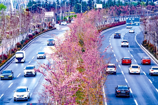3月25日,改造提升之后的仰韶大道紫荆花盛开,车辆穿行于花海之间,成为春日一道美丽的风景。记者 杜杰 摄