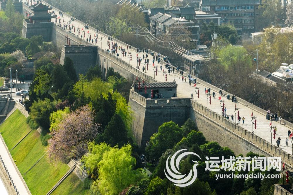 这是西安明城墙景色(3月25日摄)。近日,陕西西安明城墙旁春意渐浓,吸引不少市民游客前来踏青。