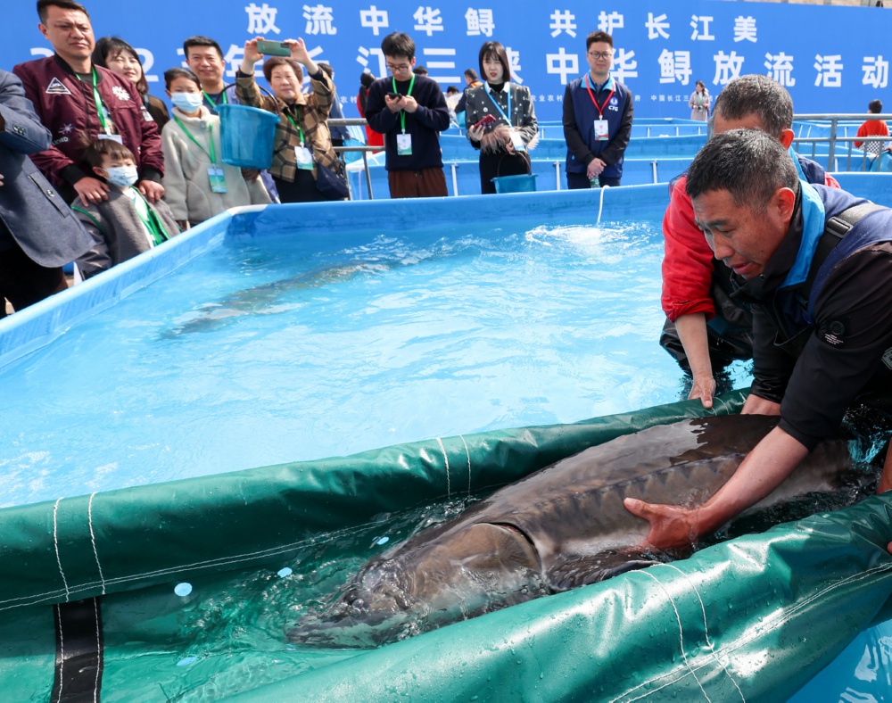 3月26日,工作人员在活动现场转运中华鲟准备放流。 2023年长江三峡中华鲟放流活动3月25日至28日在湖北省宜昌市胭脂园长江珍稀鱼类放流点举行,活动期间分批次放流20万尾不同规格的中华鲟。这是三峡集团实施的第68次中华鲟放流,放流的中华鲟延续“中、青、幼”相结合的科学放流策略,可实现对中华鲟野外种群数量的补充和年龄结构的调节。新华社发