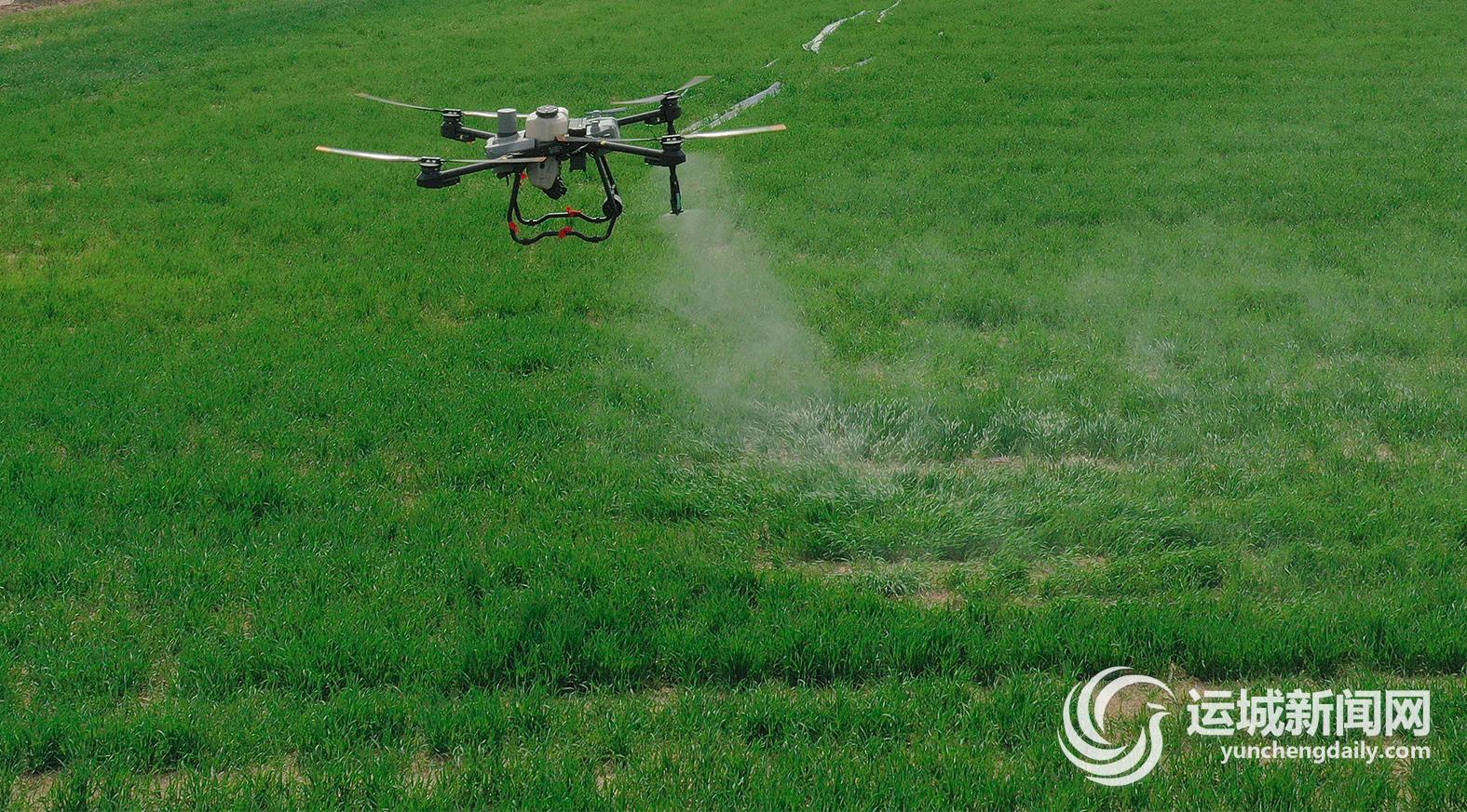 3月26日,万荣县某家庭农场山坡小麦产区,农技人员用无人机为小麦喷药洒肥。