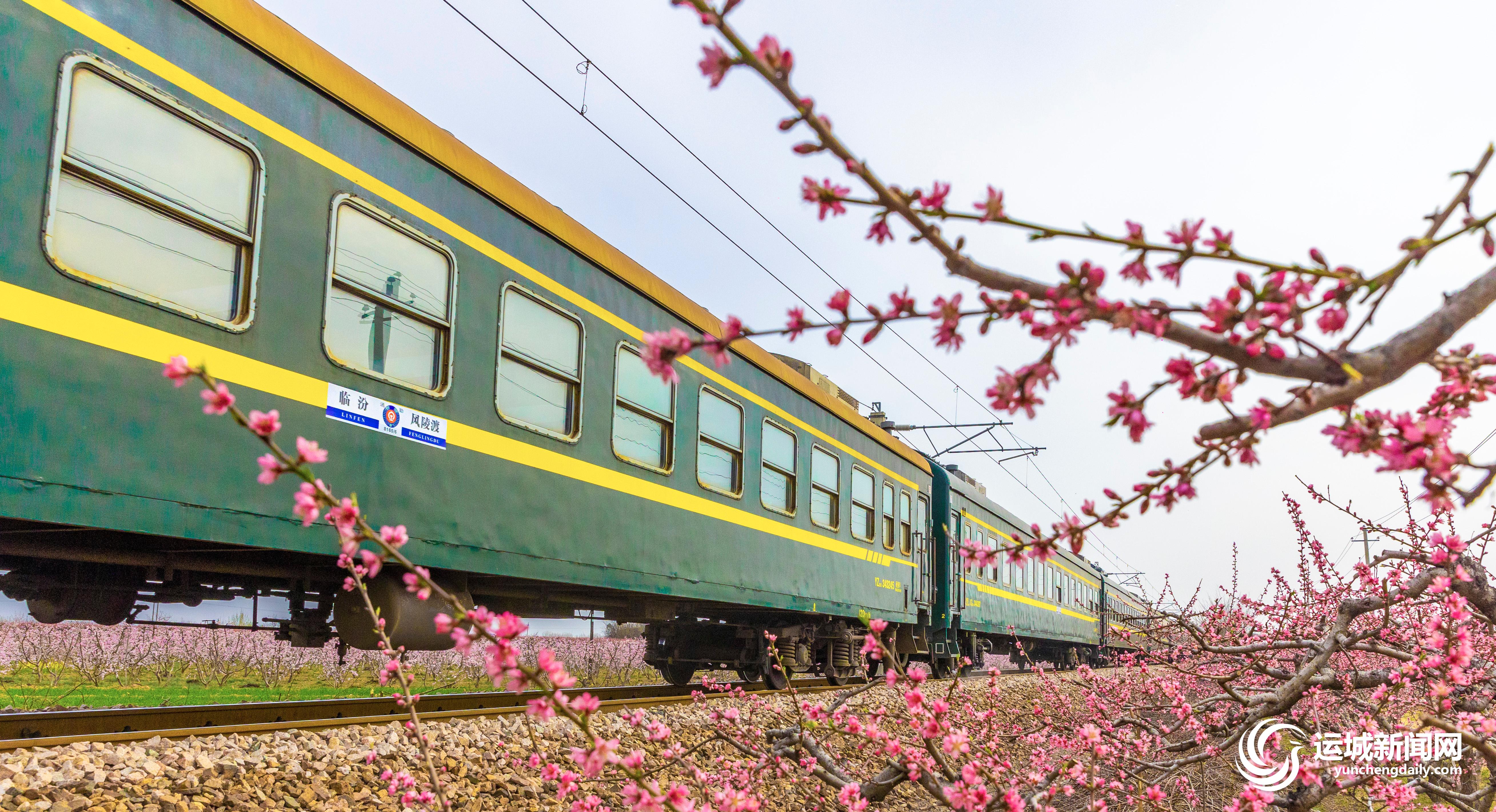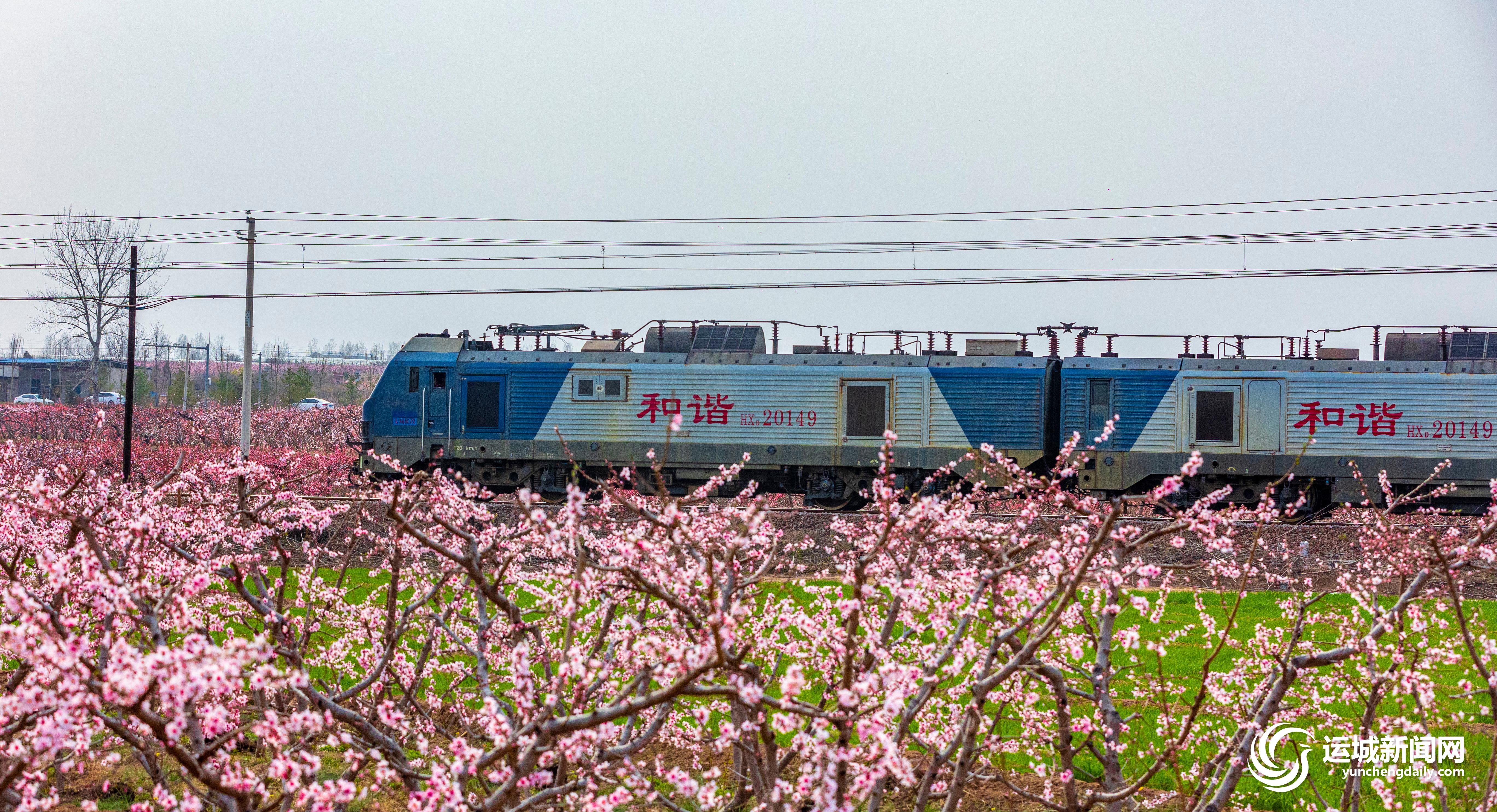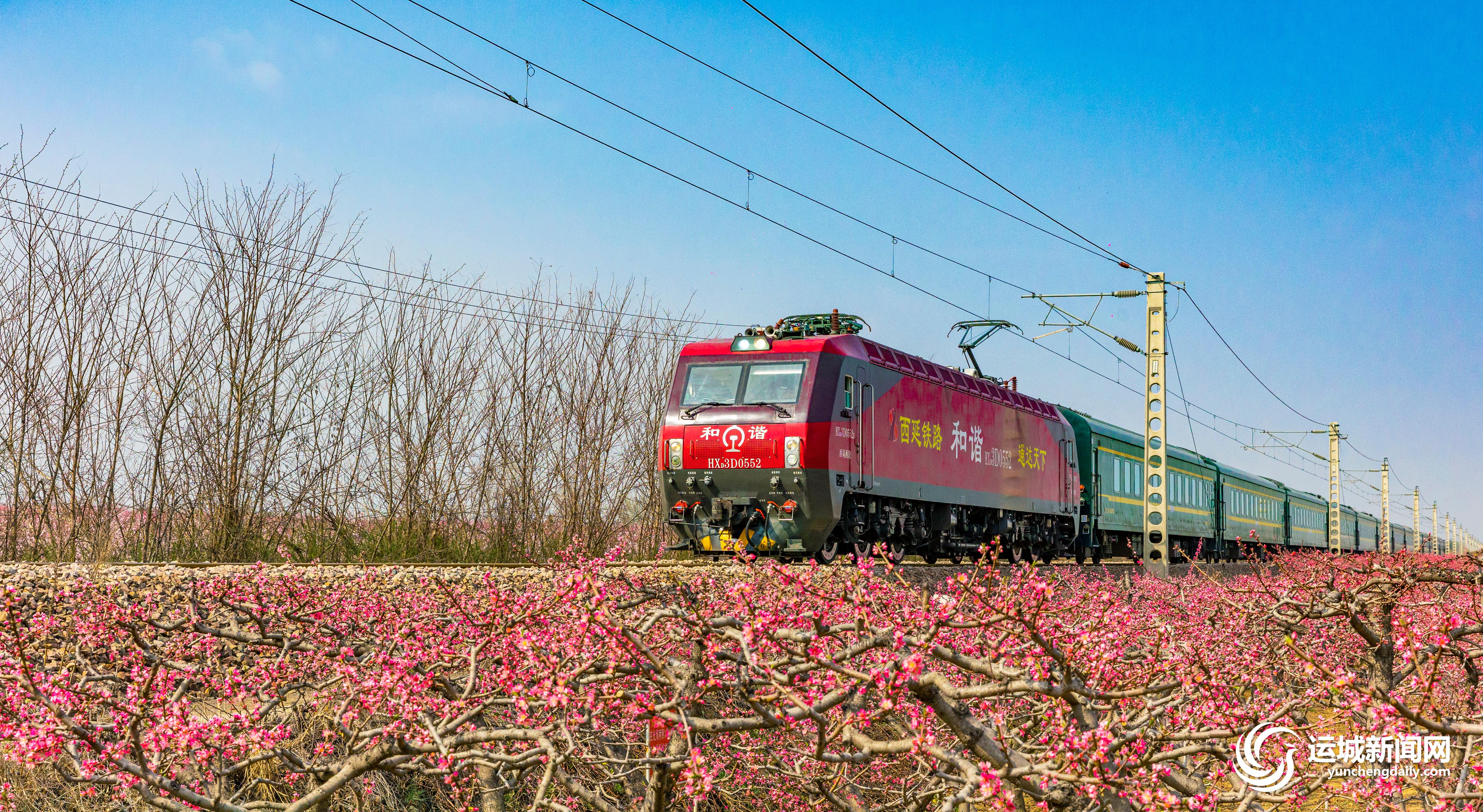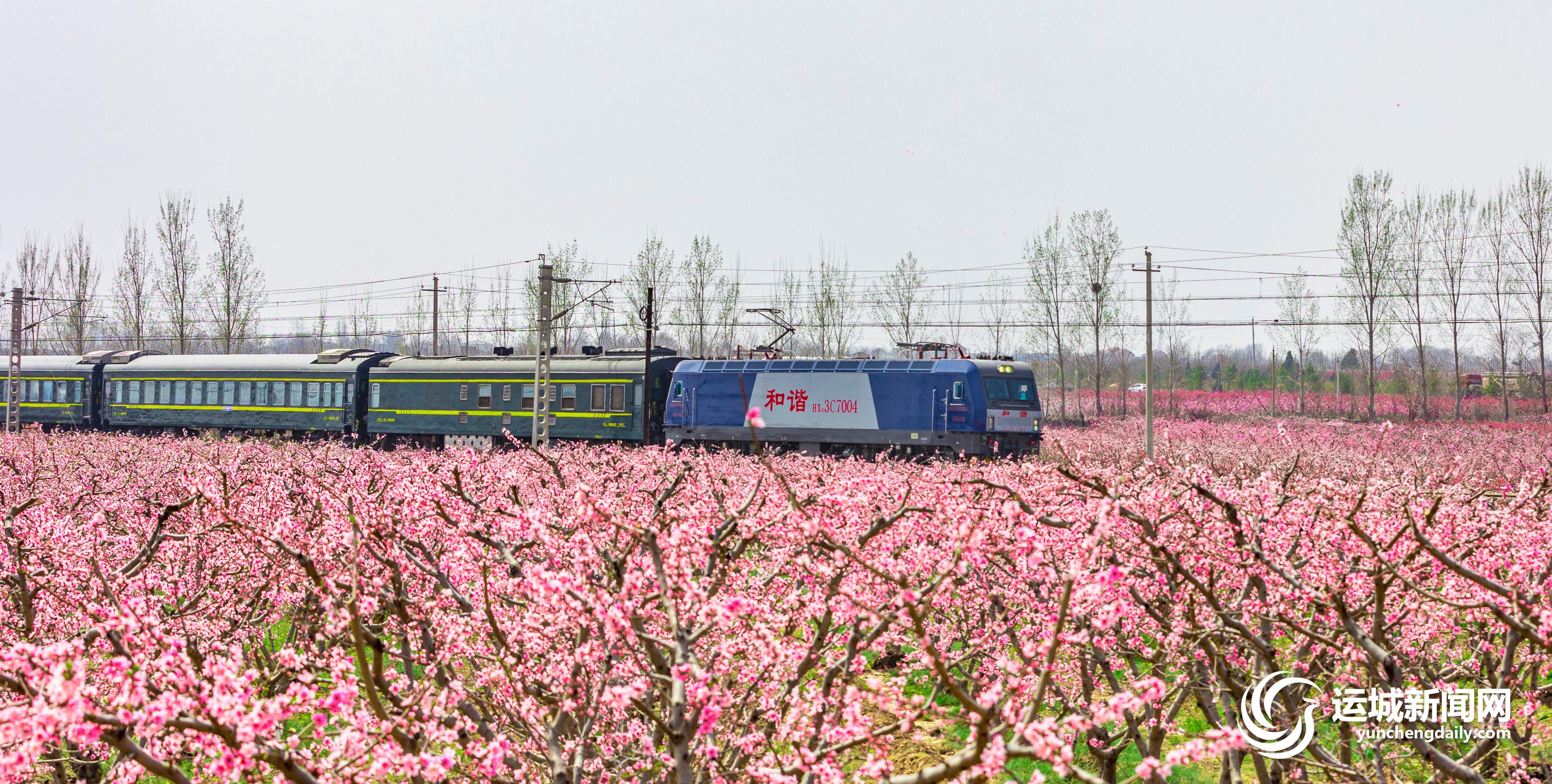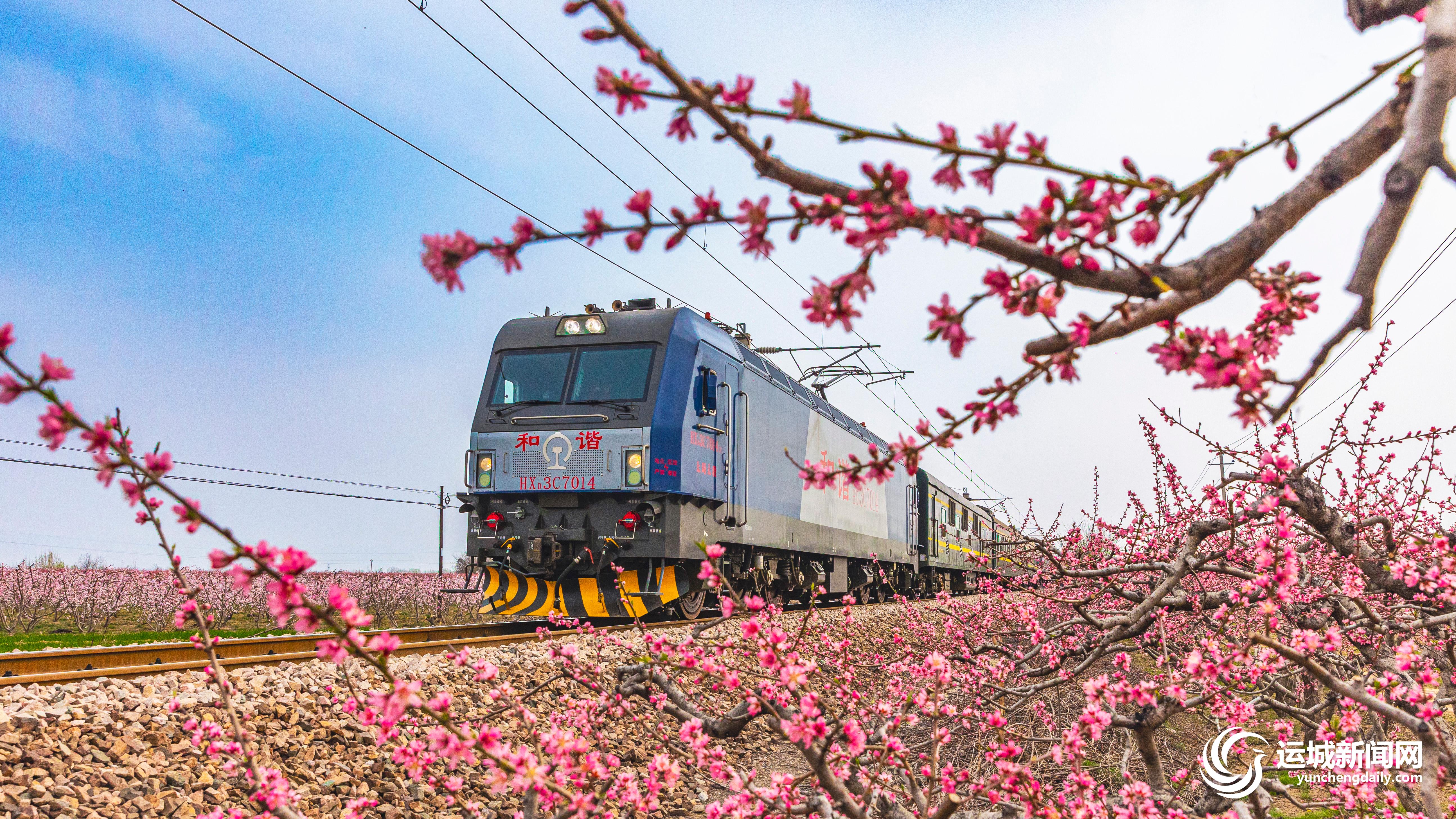 仲春时节,盐湖区境内同蒲铁路沿线的桃花岭上,数万亩桃花竞相绽放,一派春意盎然的景象。3月26日,一列“和谐号”客运机车穿行在花海之中,构成一幅春日美景图。
