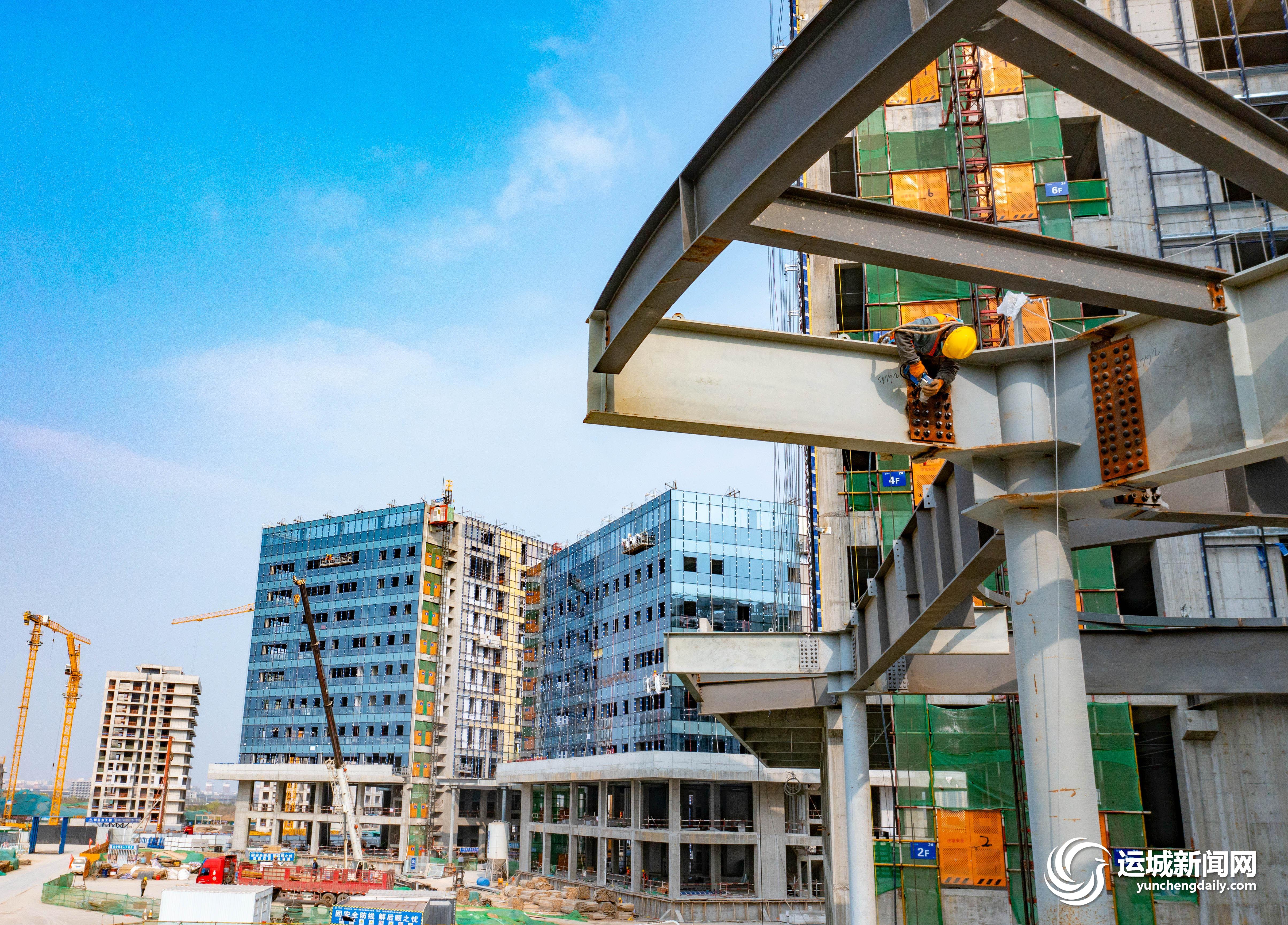 3月25日,在黄河金三角(运城)创新生态集聚区科创城项目建设现场,工人们在紧张施工。