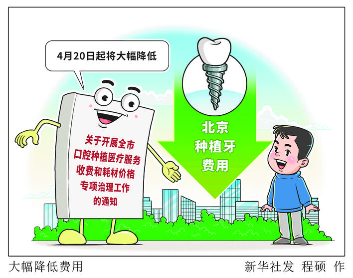 北京市医疗保障局会同市卫生健康委、市人力社保局近日出台《关于开展全市口腔种植医疗服务收费和耗材价格专项治理工作的通知》,将于4月20日起同步实施口腔种植医疗服务收费、种植体集中带量采购、牙冠限价挂网“三位一体”综合治理。届时,口腔种植类医疗服务项目、种植体及牙冠价格将大幅降低。 新华社发 程硕 作
