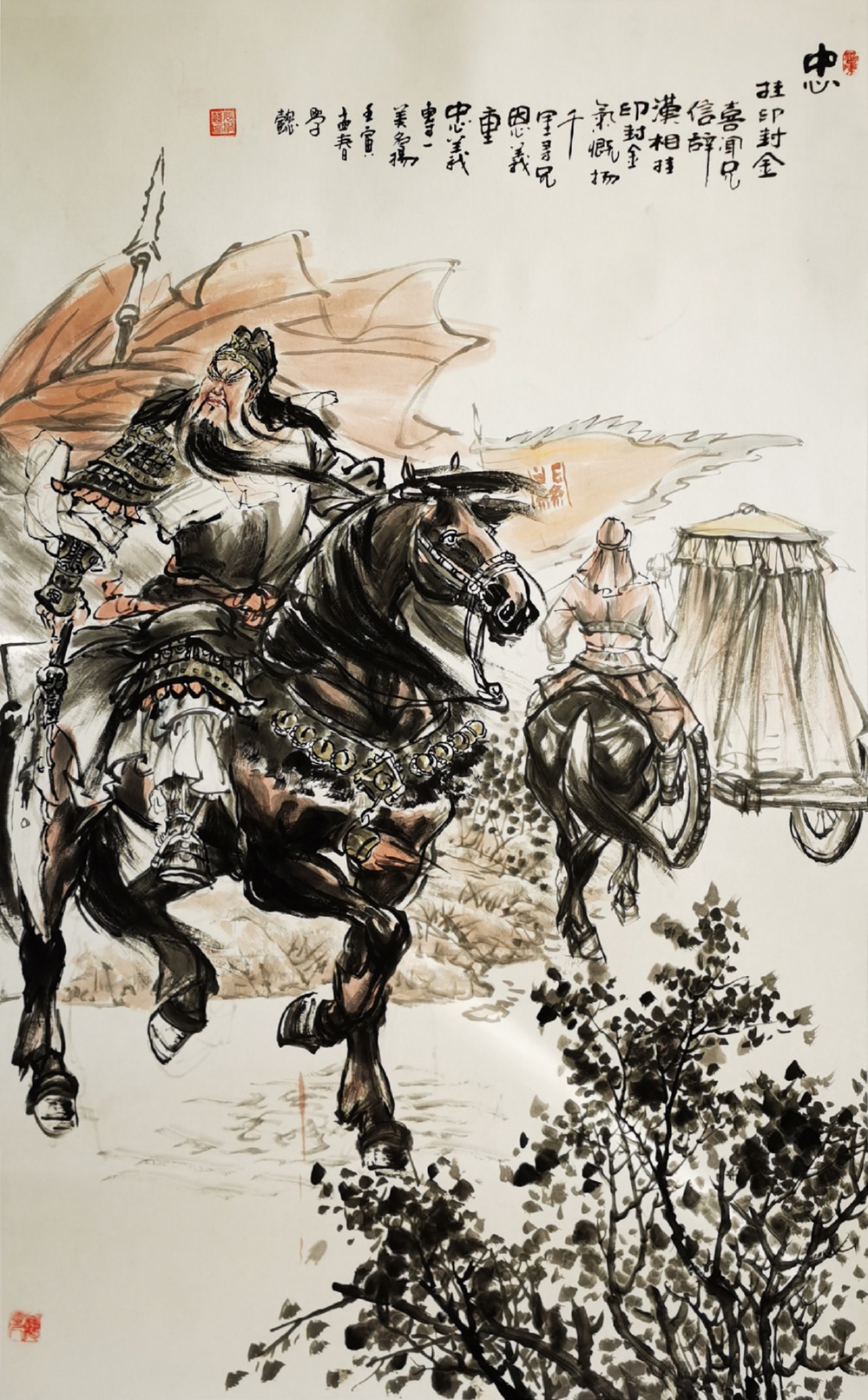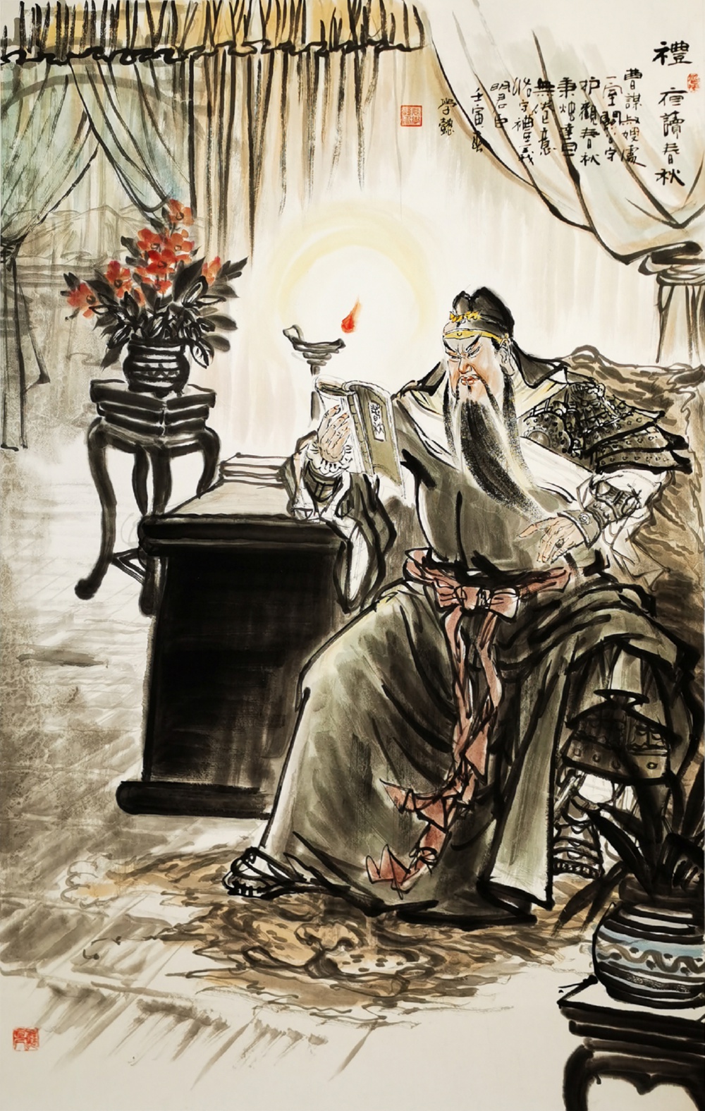 此后十多年间,他心无旁骛,专注关公,笔墨更臻成熟老到。特别是近年来,他与时俱进、推陈出新,围绕关公身上凝结的“忠义仁勇礼智信”精神,投入大量精力与心血。