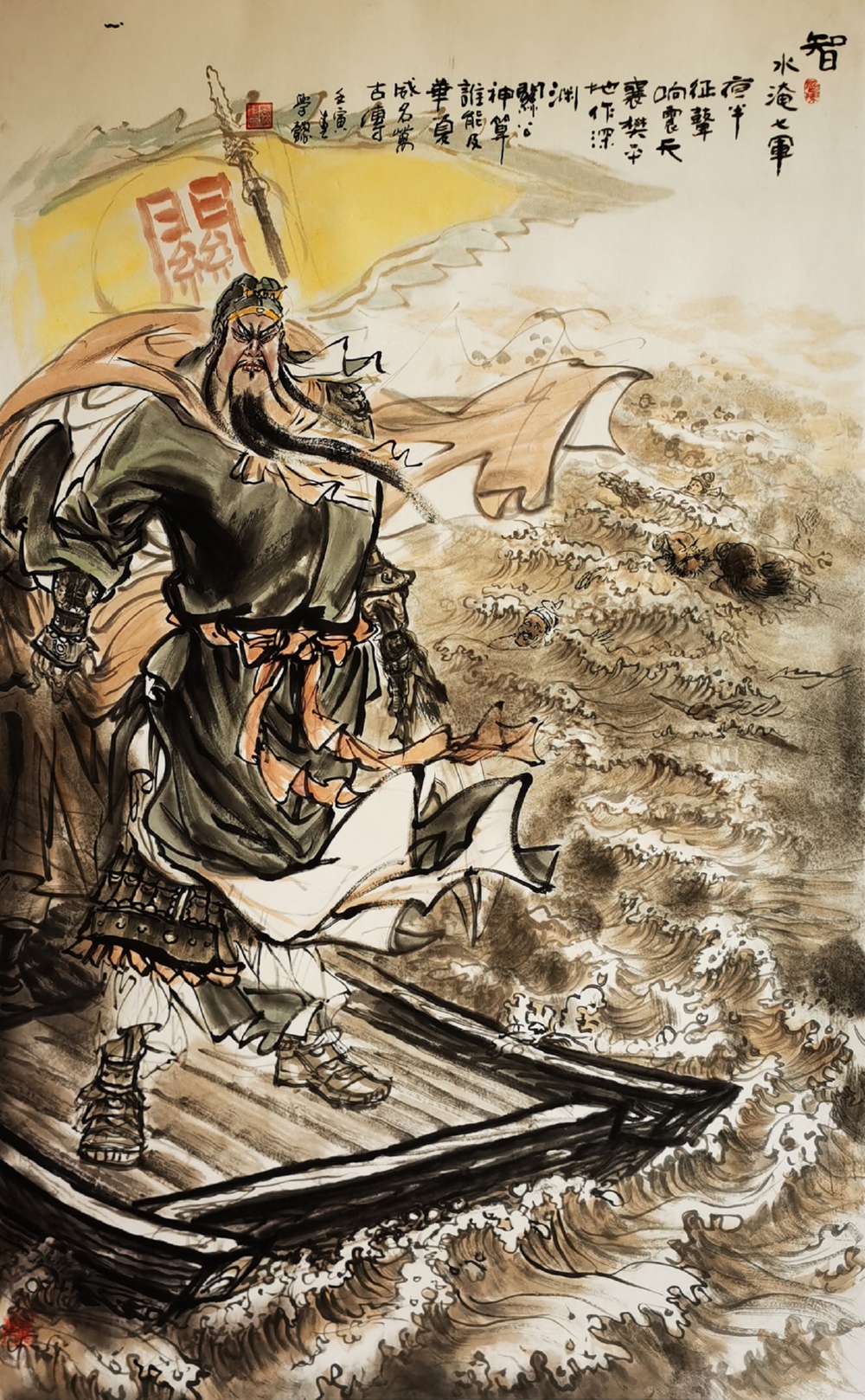 江面波涛汹涌,威武霸气的关公稳坐于船头,他目光坚毅、神色自若,背后的“关字旗”迎风招展,青龙偃月刀则锋芒逼人……