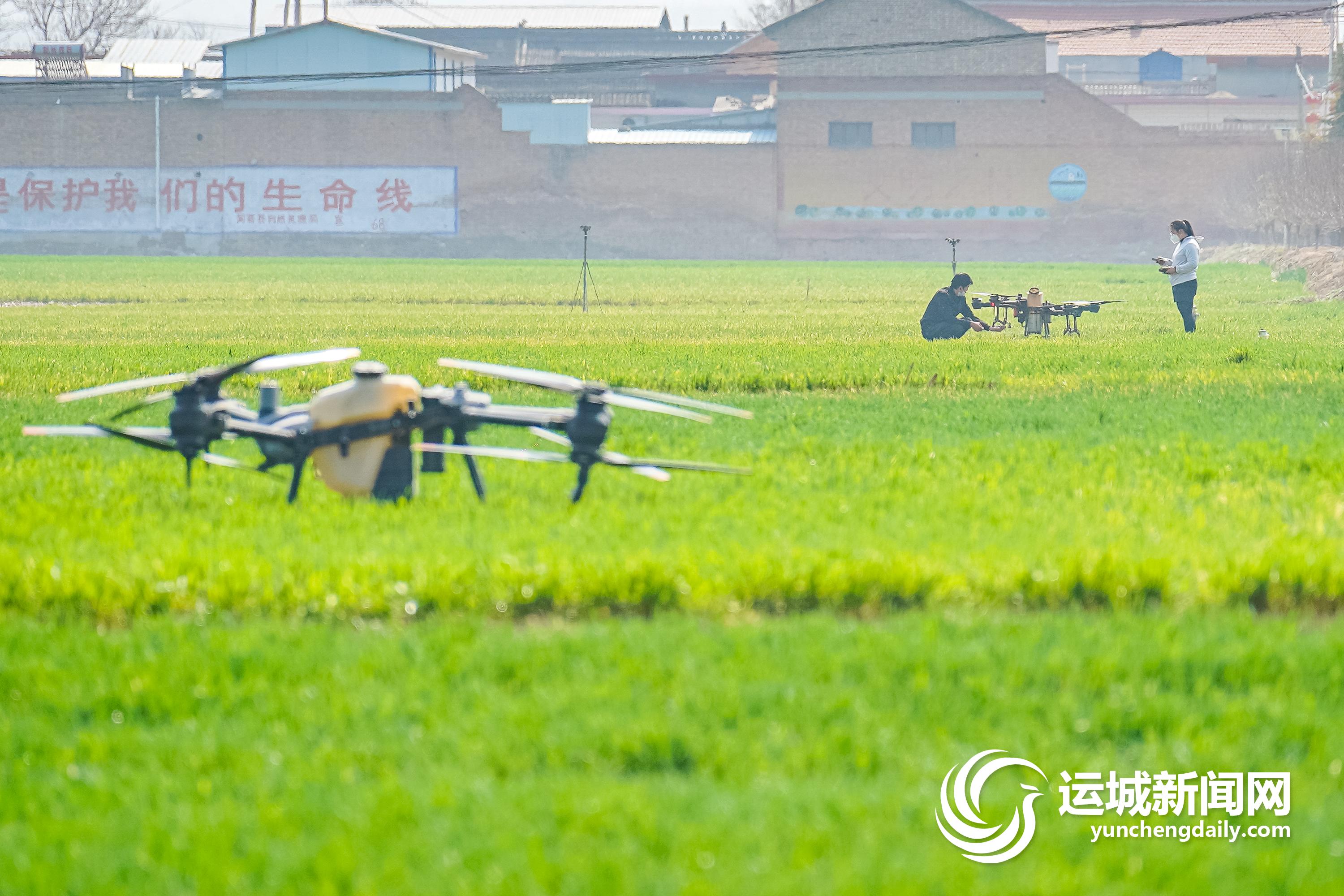 闻喜县裴社镇大泽村樊金龙的连片麦田里,伴随着急速的“嗡嗡”声,3架植保无人机腾空而起,在工作人员的遥控下,叶面肥被缓缓喷洒到绿油油的麦田。