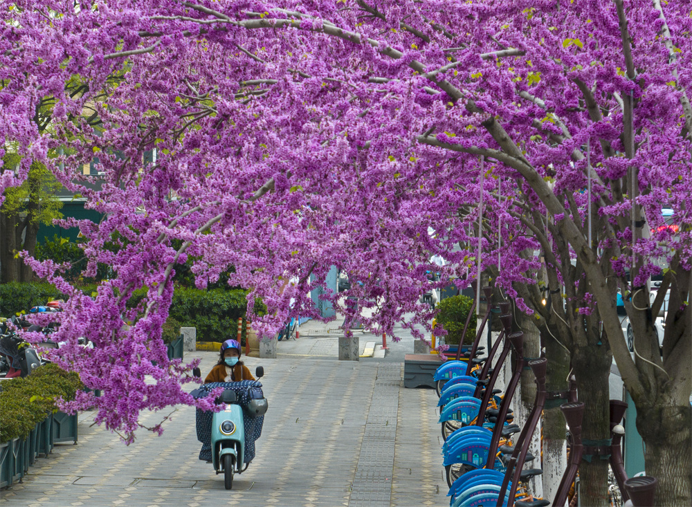 近日,宁波市鄞州区甬港北路两侧的紫荆花开放,一串串紫色的花朵娇艳醉人。穿行其间,一路繁花相伴。