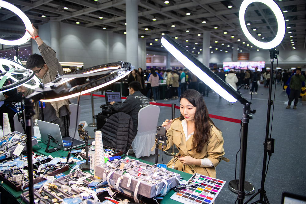 3月29日,在湖南国际会展中心,一名女子通过直播推销商品。