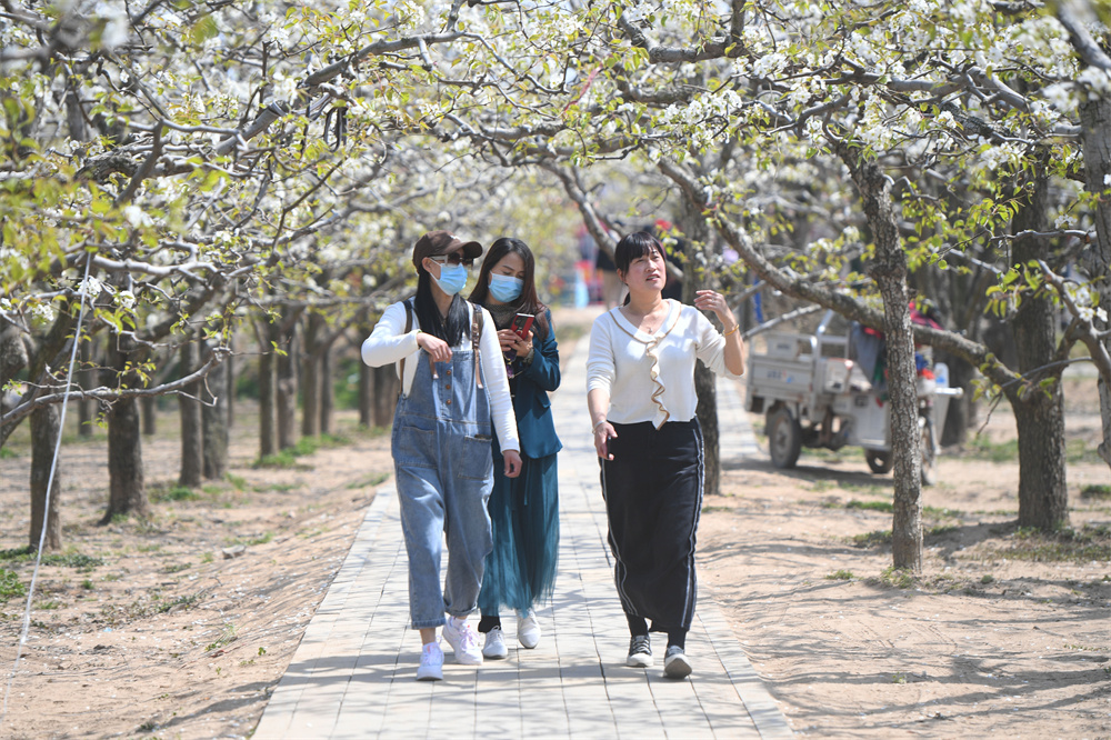 3月29日,游客在宁陵县万亩梨园景区游览。