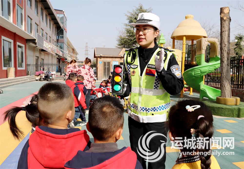 当天,市公安局盐湖分局交警大队宣传科民辅警走进辖区贝恩幼儿园,在课堂上通过挂图为孩子们讲解什么是汽车盲区、过马路注意什么、后排座要系安全带、如何戴好安全头盔等安全出行知识。