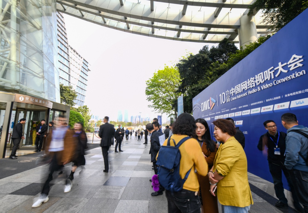 3月30日,参会者在第十届中国网络视听大会主会场外交流。
