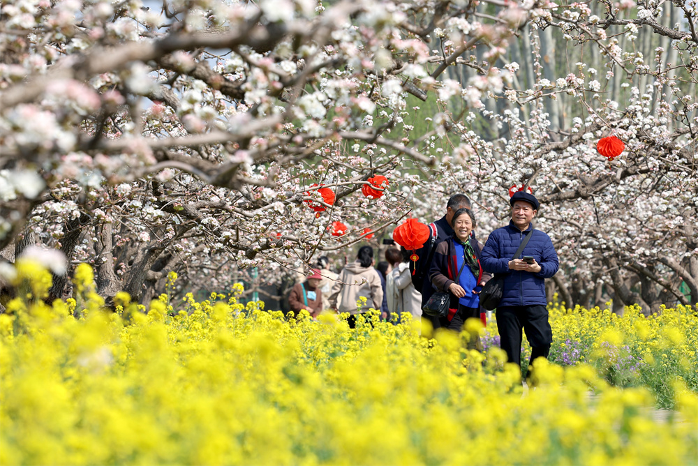 3月30日,游客在河北省石家庄晋州市周家庄乡梨园内踏青赏花。