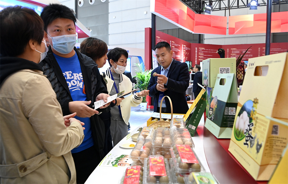 3月30日,首届全国退役军人创业创新成果展交会现场,参观者在展位前咨询。
