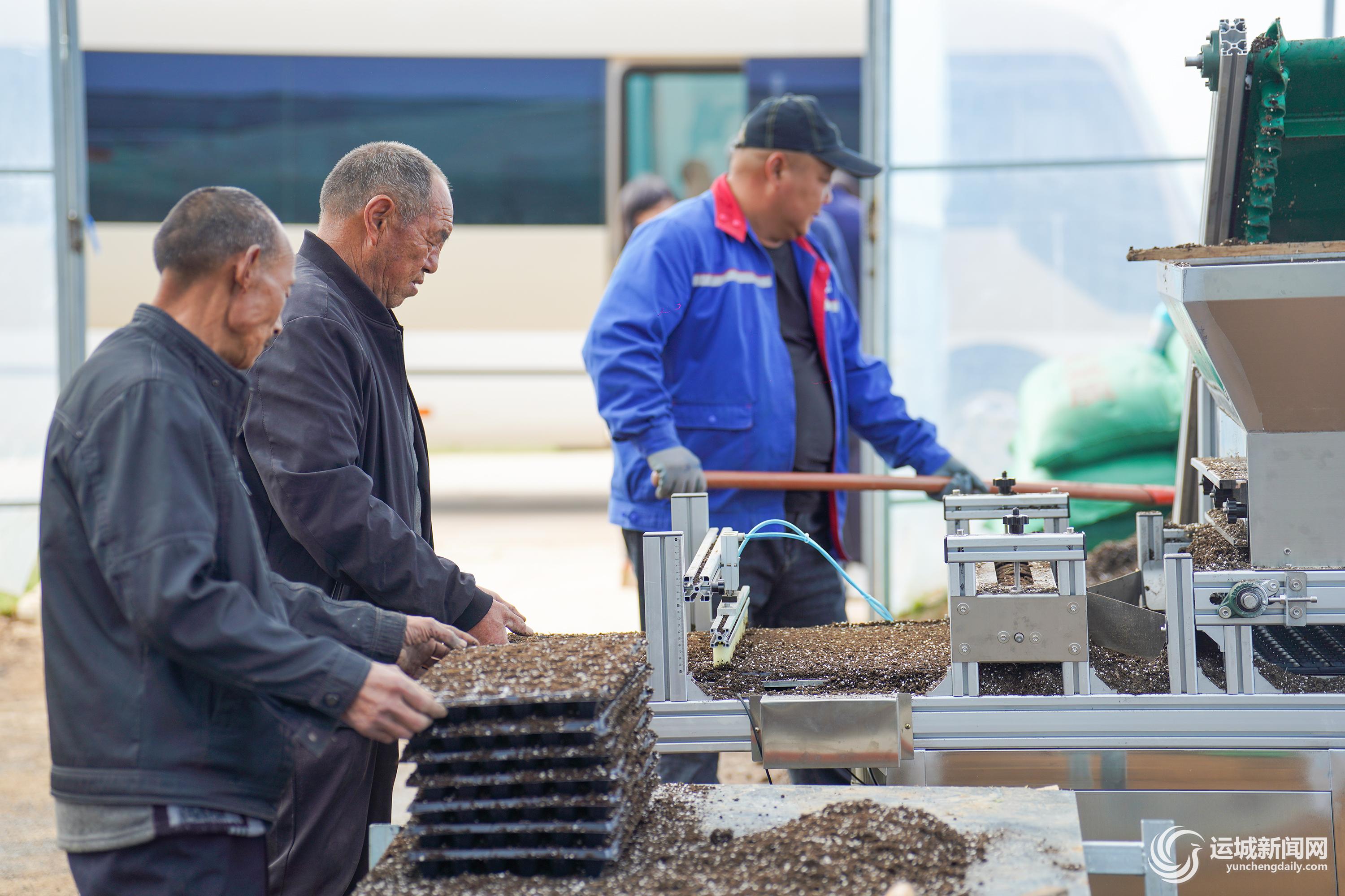 芮城县学张乡斜口村标准化育苗大棚内,工人在进行机械化基质装盘。