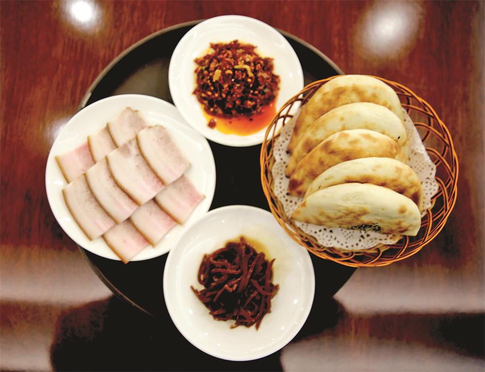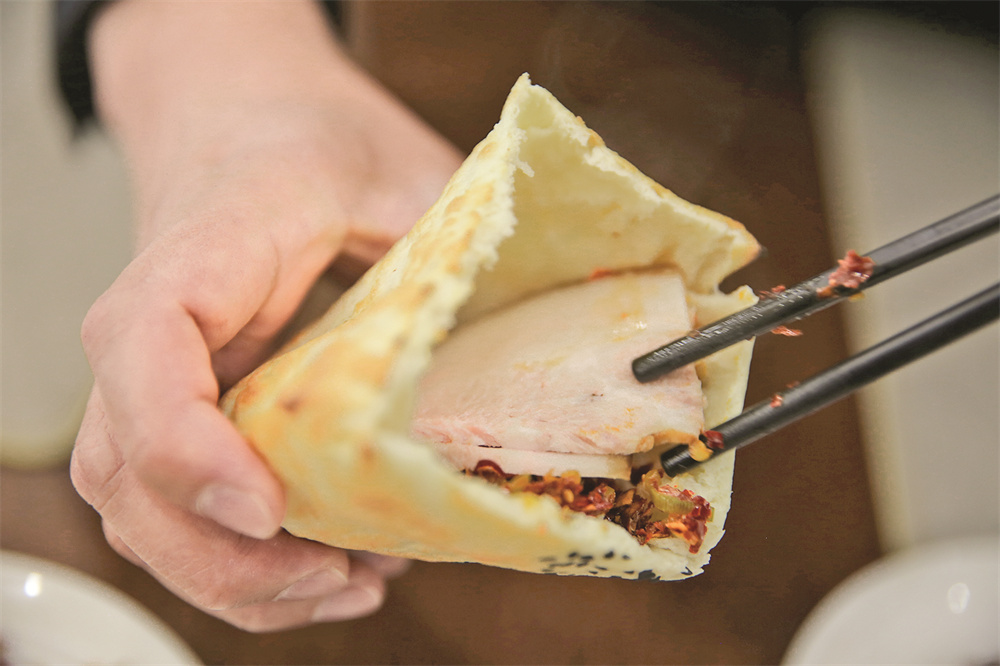 小心翼翼地掰开烫手的半圆饼,顿时一股特有的麦香味儿扑鼻而来;先抹一层爆炒的红辣子,依次加入咸菜和卤肉片;合上饼子,一口咬下,那饼子的酥脆混合着辣子肉菜的咸香,立刻萦绕在唇齿之间……