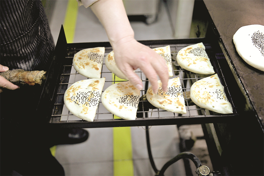 “刚开始饼子是由炭火烤制的,很考验手艺师傅对火候的掌控功力。近几年,行业经营提升改造,将过去炭火烘烤的做法改为更加环保的气炉烤制,火候的控制更加容易,饼子表面受热更加均匀,表皮焦黄依旧,口味纯正如初。”芦宣宣说,不管是哪种烤制,和面、制饼、煎烤等都是制作饼子的几道关键工序。
