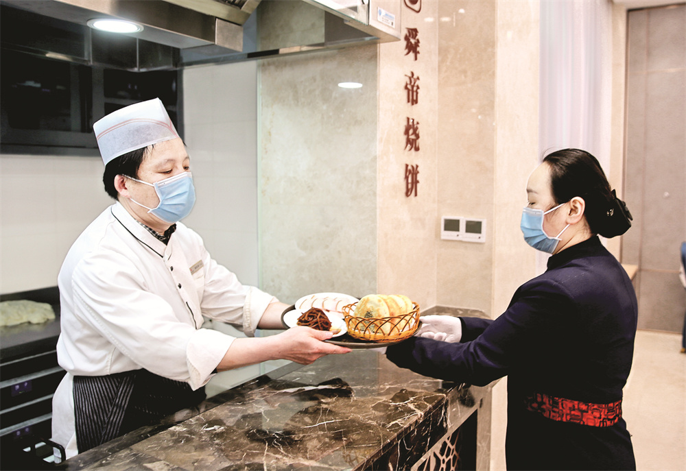 可别小瞧这半圆饼,运城宾馆一做就是几十年。几十年的卷、压、擀、烤,让半圆饼成了宾馆的一道招牌菜、必点菜、压轴菜。运城宾馆餐饮部副主任芦宣宣说,不管是到宾馆吃自助的,还是点套餐的,或者单点桌饭的,“半圆饼+配菜”是绕不过的。
