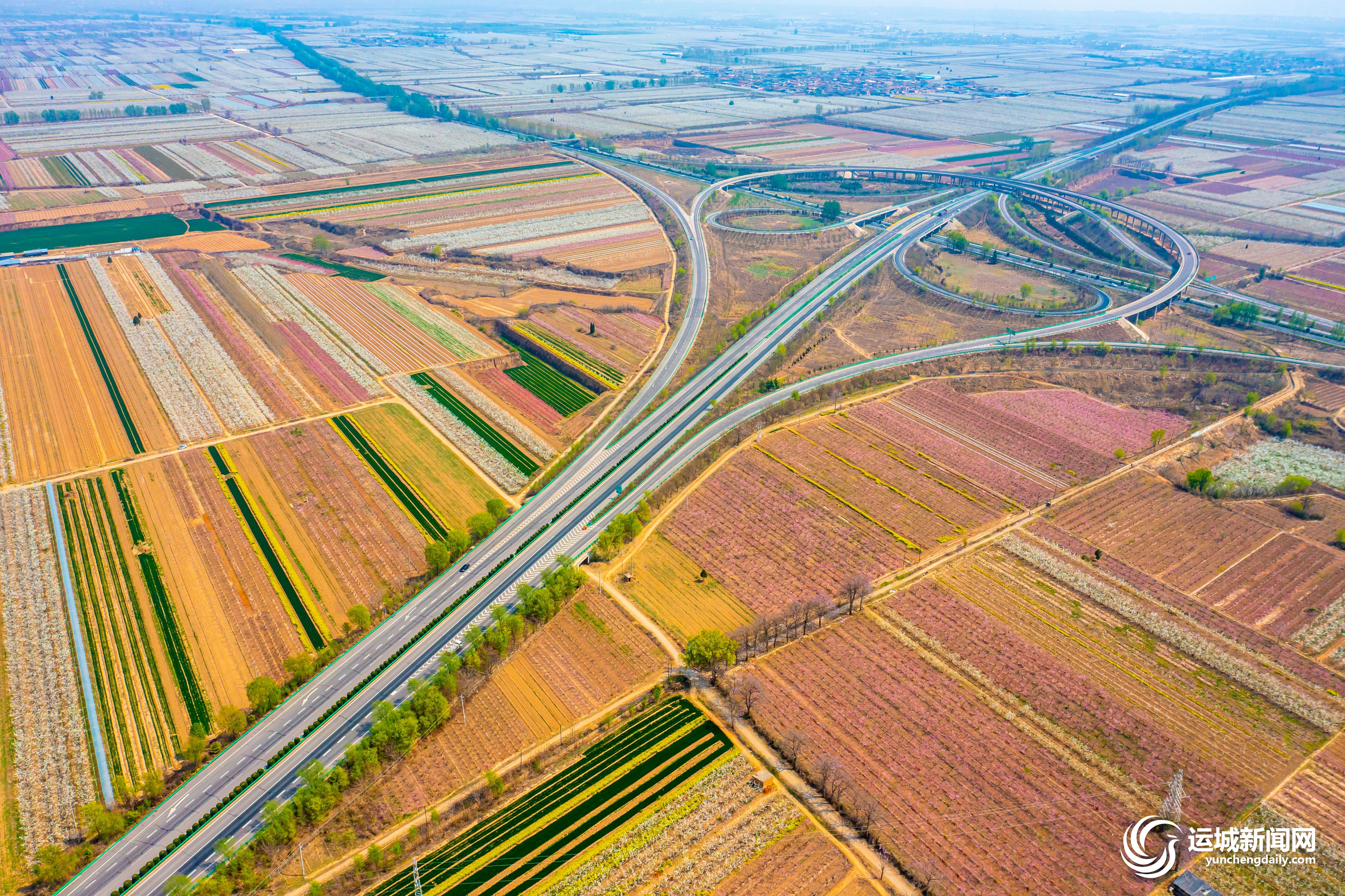 图为盐湖区龙居镇境内的运风高速公路两旁,梨花、桃花、油菜花竞相绽放,与绿油油的麦田交相辉映,构成了一幅色彩斑斓的春景图。记者 闫 鑫 摄