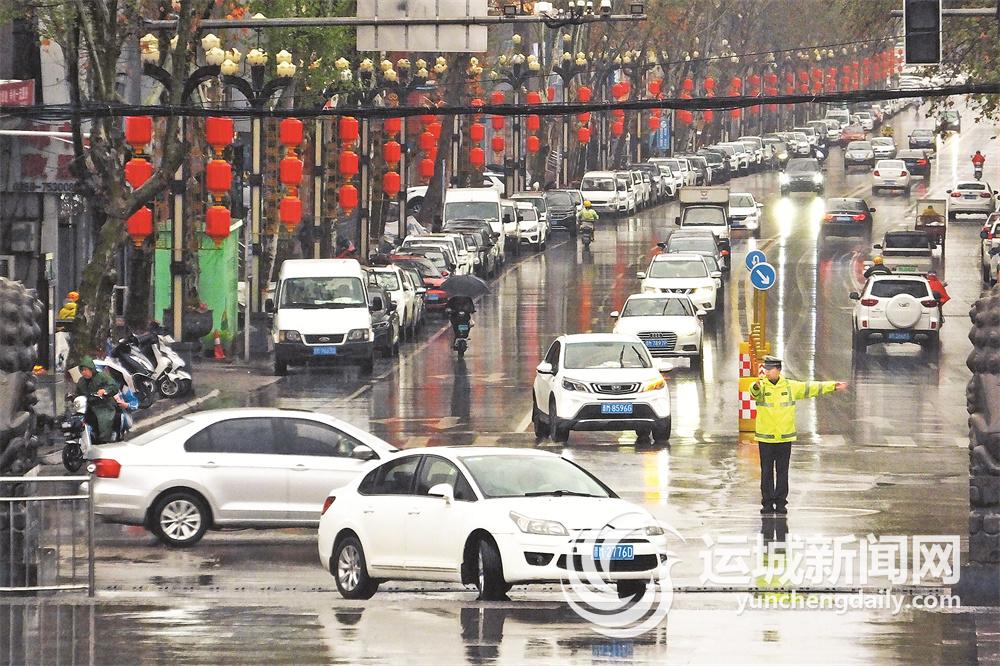4月2日、3日,我市出现持续降雨,公安交警紧急启动雨雪恶劣天气应急预案,全员上岗上路,确保道路畅通、群众安全出行。图为新绛县交警在龙兴寺交通枢纽岗,冒雨坚守岗位,指挥车辆、疏导交通。