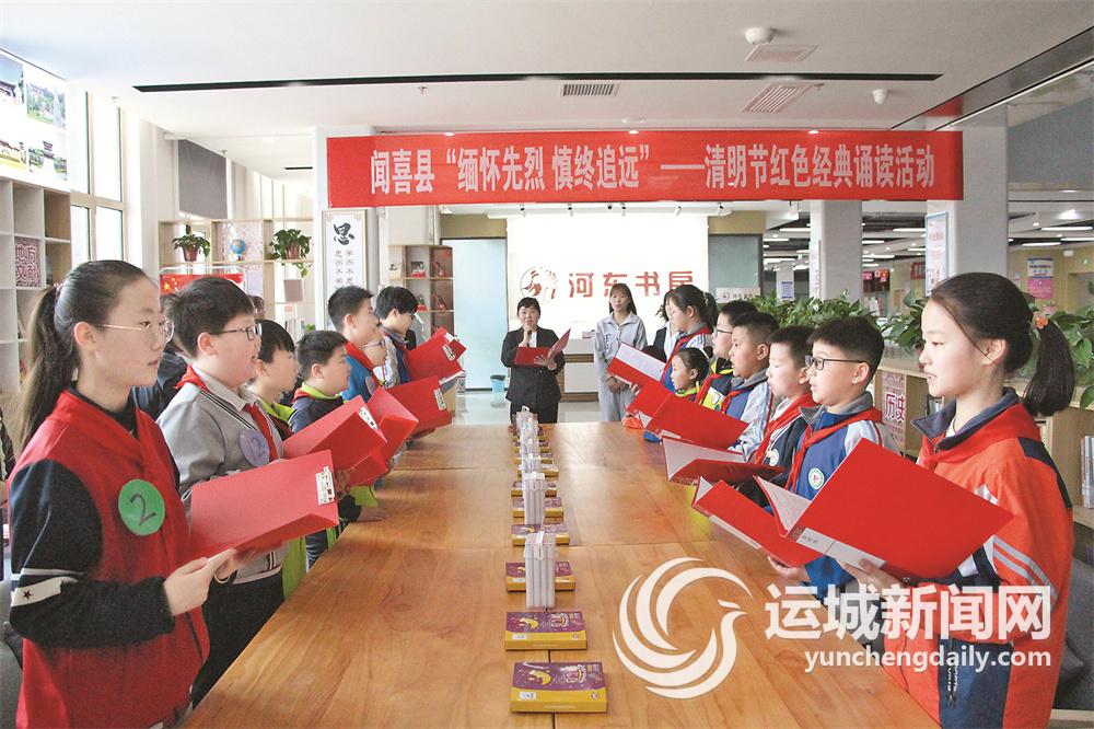 4月2日,在闻喜县政务服务中心大厅河东书房,来自该县县直多个学校的孩子们在诵读红色经典英雄故事。