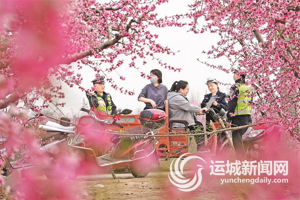 ▲民警向游客发放交通安全宣传手册、讲解交通安全法律法规知识。3月30日,“游绛州古城,赏万亩桃花”新绛县第十届桃花观光交流会在该县万安镇拉开帷幕。借此机会,新绛公安民警以花为媒,组织宣传民警开展农村道路交通安全宣传活动。特约摄影 高新生