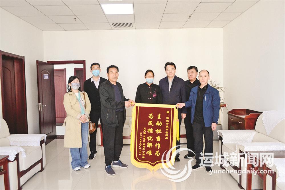 运城晚报讯(记者 祁克宁 见习记者 赵雪)“以前出门,老是被家门口的污水熏到,现在排污水管重新疏通,再也不用担心了!”近日,盐化劳服公司工地家属院居民代表将写有“主动担当作为 为民排忧解难”的锦旗送到市城市管理局(上图),真诚感谢市城市管理局为其解决污水管道堵塞的问题。