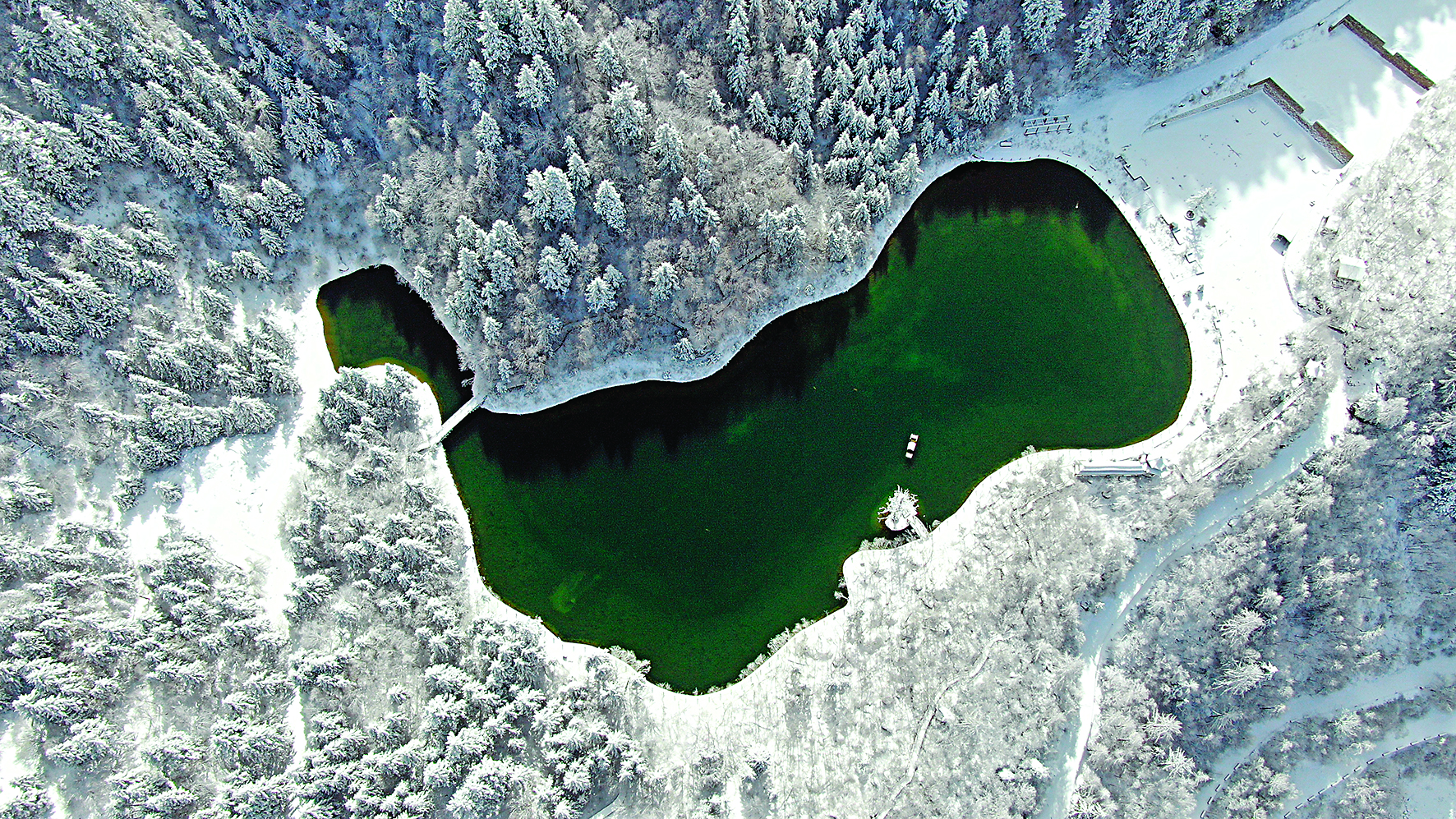 4月6日在官鹅沟森林公园鹅嫚沟景区拍摄的雪景(无人机照片)。