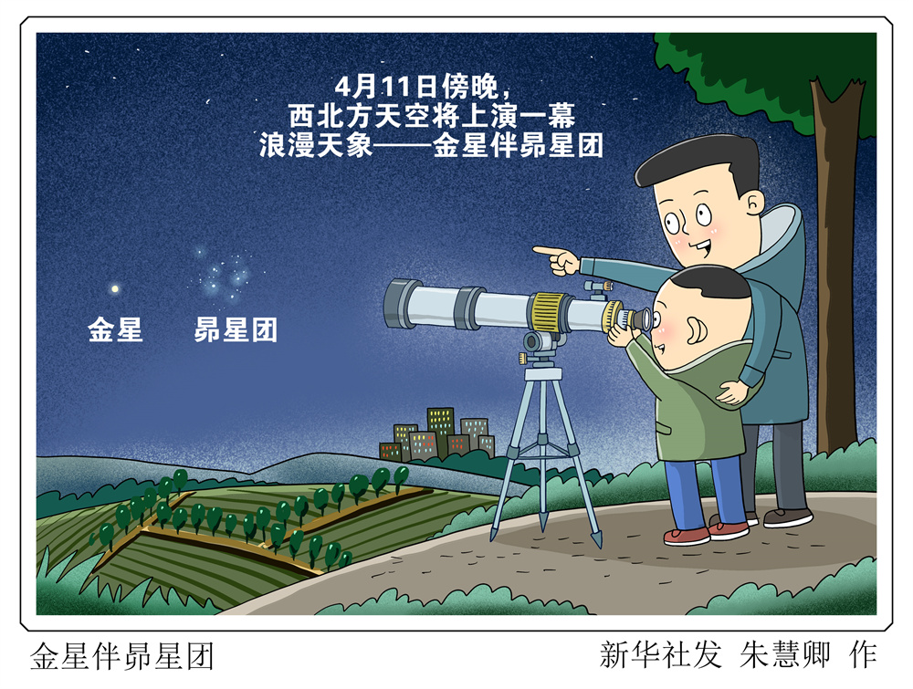 天文科普专家介绍,4月11日傍晚,西北方天空将上演一幕浪漫天象——金星伴昴星团,明亮的金星镶嵌在著名的昴星团旁,分外绚丽。届时只要天气晴好,我国感兴趣的公众用裸眼或小型天文望远镜就能欣赏到这浪漫一幕。 新华社发 朱慧卿 作