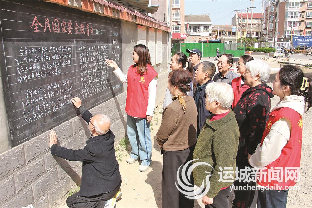 4月10日,闻喜县社区服务中心西城社区工作人员在辖区桃园西街南巷黑板报前向居民进行国家安全教育宣传。