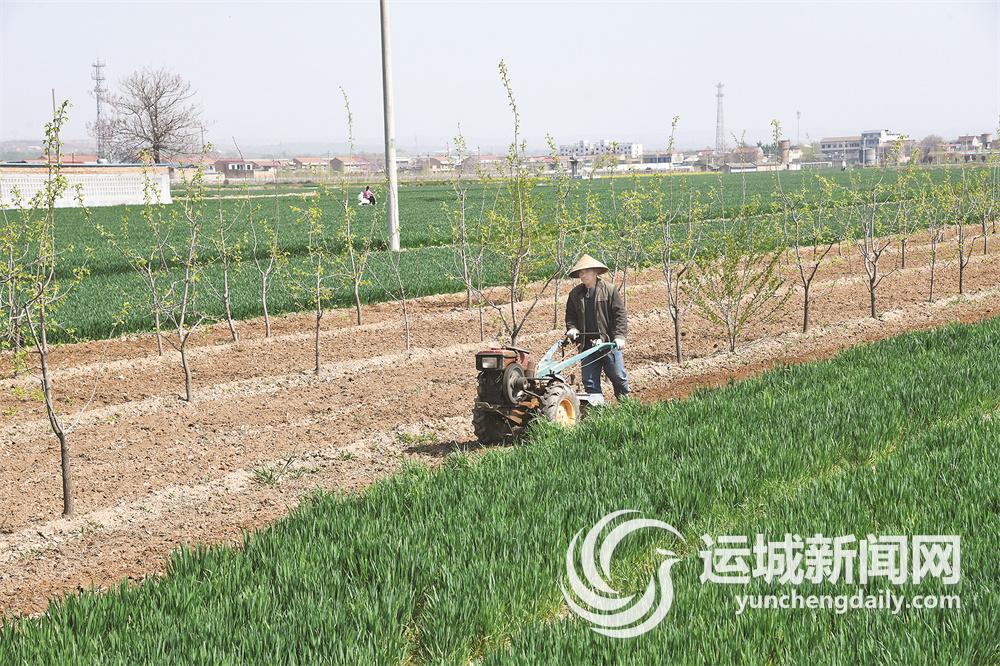4月11日,闻喜县郭家庄镇辛庄村果农在果园里耕地施肥。
