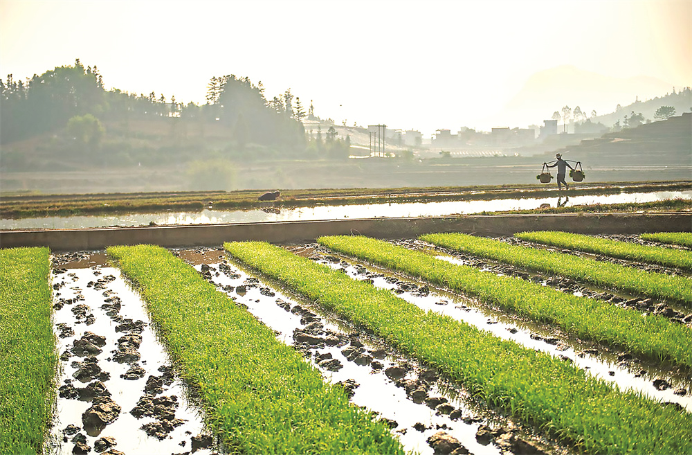 4月12日,云南省文山市薄竹镇农民挑着准备移栽的秧苗走在田间。