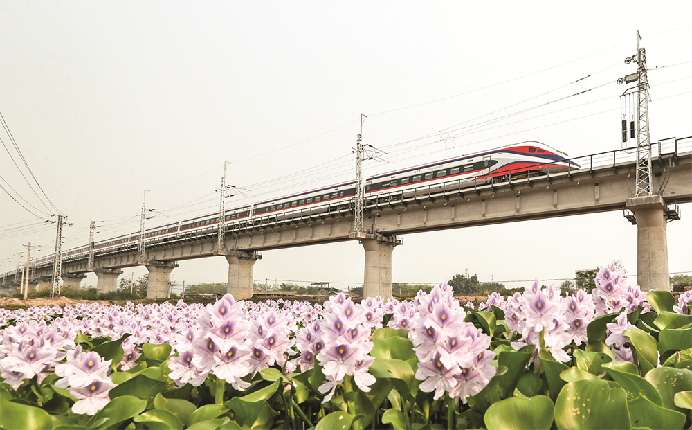 4月13日,从老挝万象站驶出的D888次“澜沧号”列车行驶在云南省西双版纳州境内的中老铁路橄榄坝特大桥上。