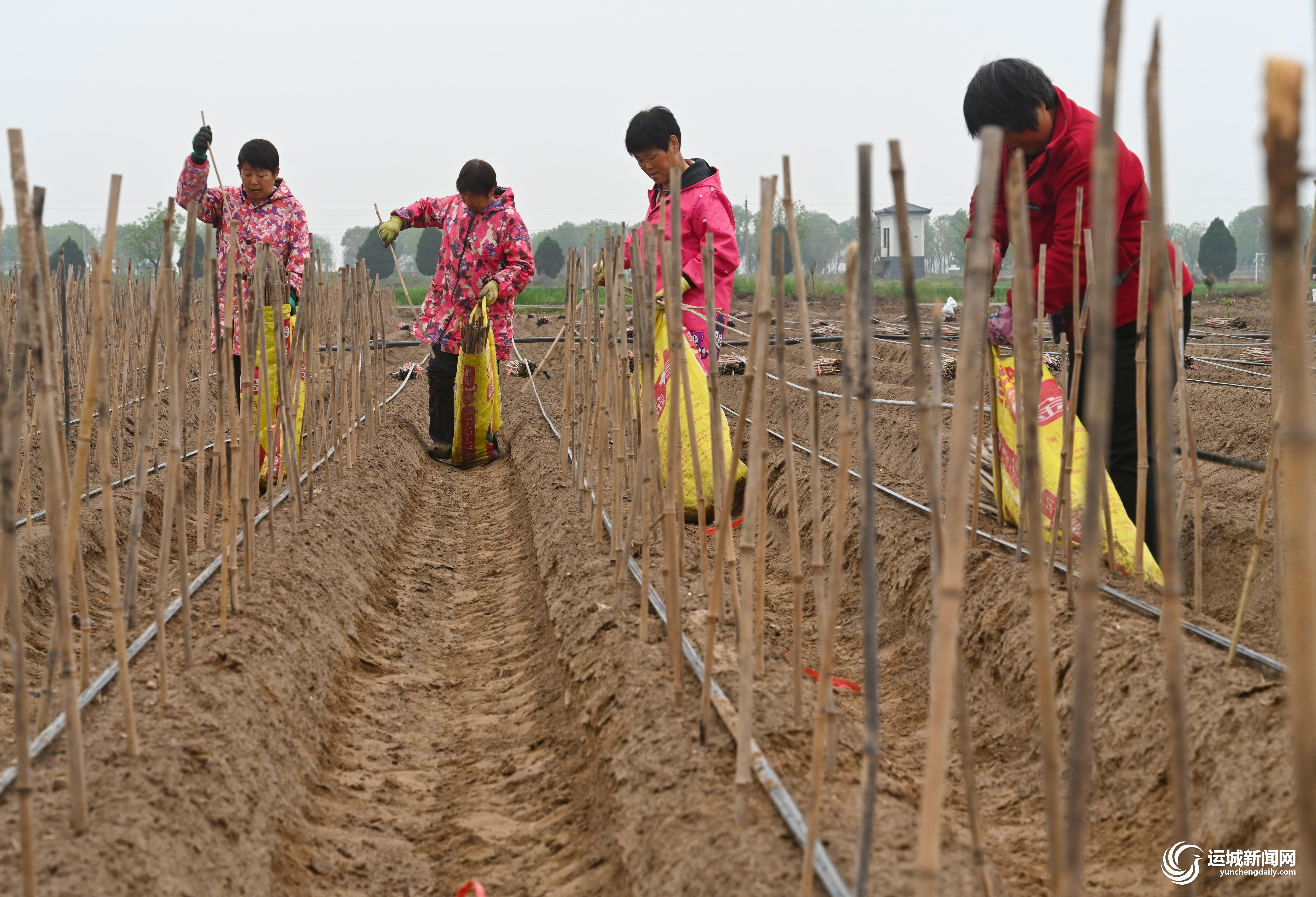 4月14日,永济蒲州镇农民在黄河滩的山药地里实施插杆作业。