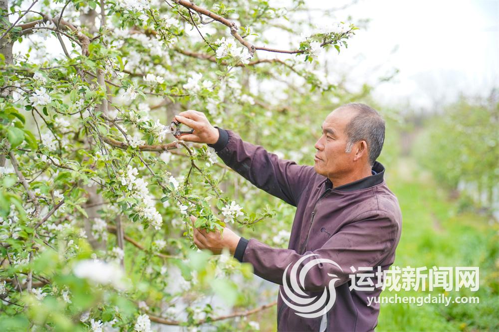 位于临猗县北景乡西里村的试验站里,工作人员给结出花朵的苹果树进行疏花。
