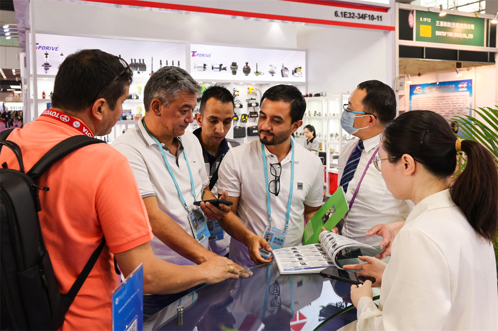 4月15日,几名来自哥伦比亚的采购商在广交会上了解中国汽配产品。 新华社记者 刘大伟 摄
