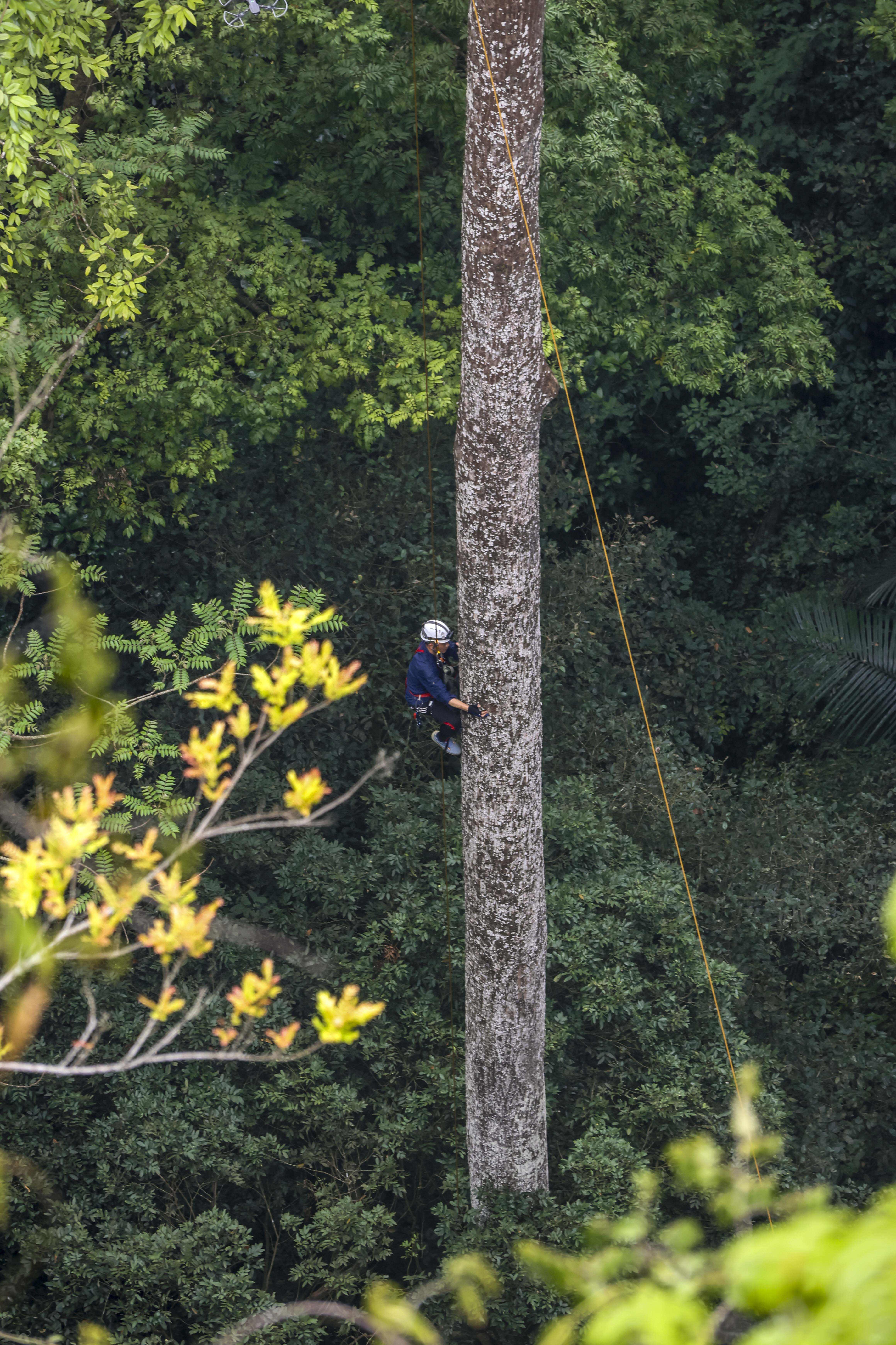 ▲3月15日,南宁蓝天救援队的黄贤铭在攀爬望天树,准备安装测量树高的超声波信标。 新华社发