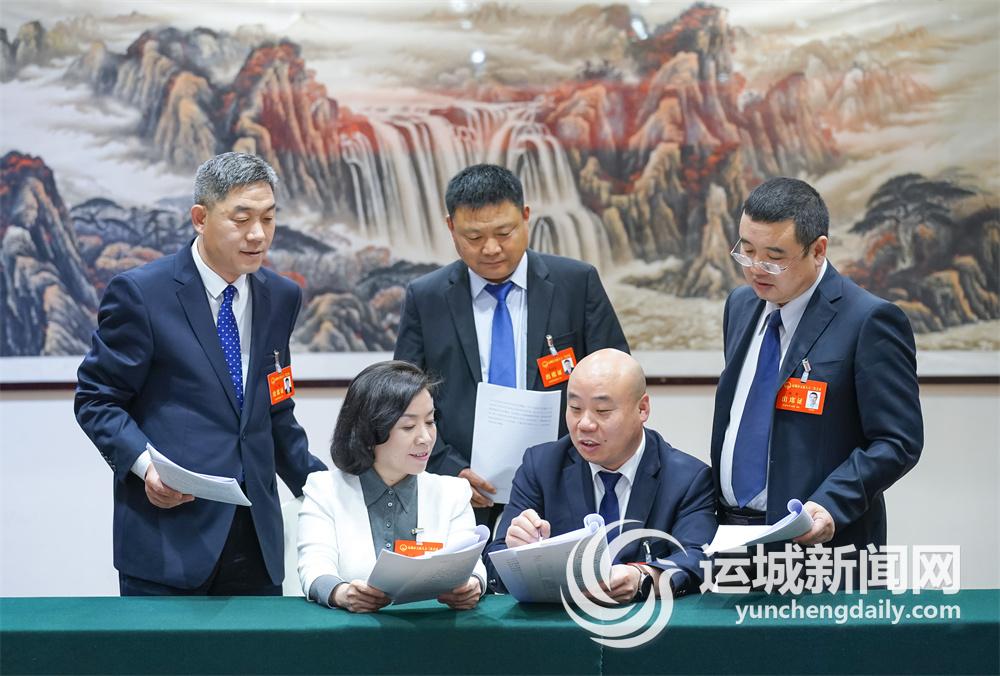4月18日,参加市五届人大三次会议的永济代表团代表审议政府工作报告。 记者 闫 鑫 摄