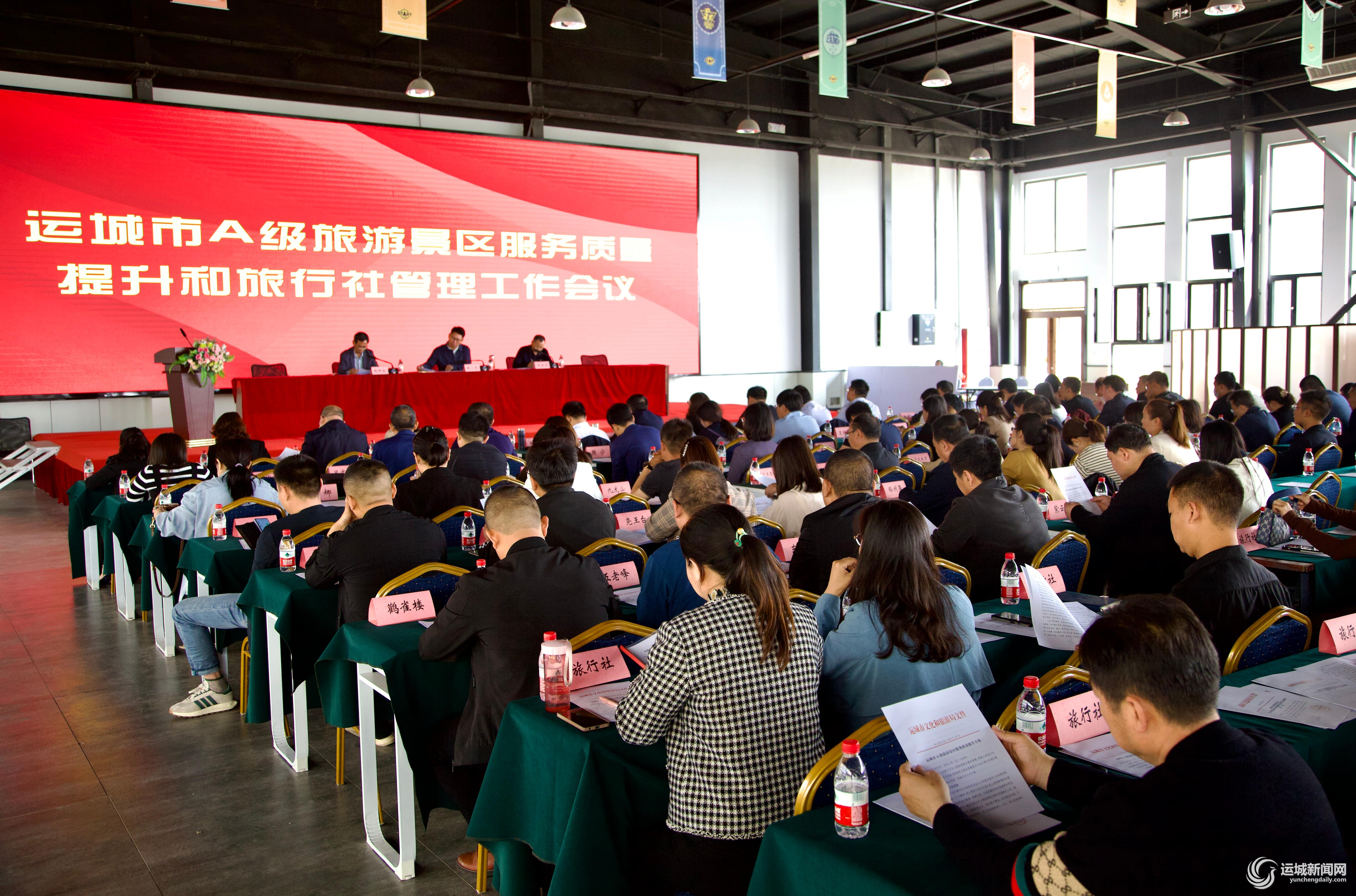 宣布并解读《运城市A级旅游景区服务质量提升方案》,A级景区代表关帝庙、鹳雀楼、圣天湖景区负责人,以及旅行社代表运城旅游百事通国际旅行社、运城商务旅行社负责人作表态发言。