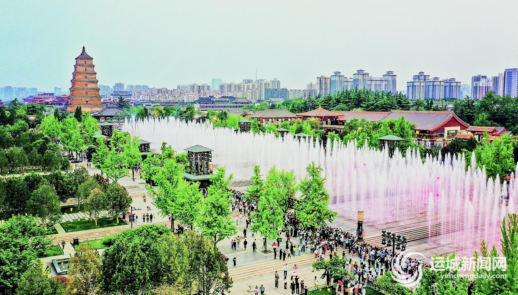 陕西西安大雁塔北广场音乐喷泉是西安旅游打卡地之一,每天会进行4场演出,吸引市民和游客前来观看。 新华社记者 刘潇 摄