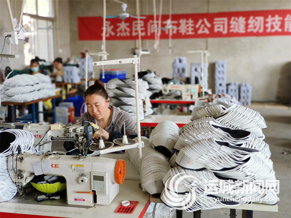 夏县永杰民间布鞋有限公司生产车间,工人在加紧赶制订单产品。