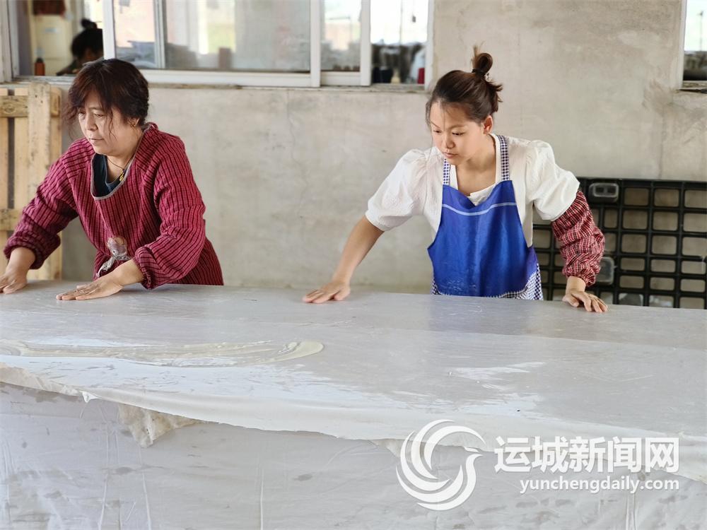 4月19日,在夏县永杰民间布鞋有限公司生产车间,几名妇女正忙着用棉布打袼褙,一层一层用浆水粘起来,这是千层底布鞋的基础,打好的袼褙晾晒后再进行剪裁底样、沿边后,才能进行手工纳制。周边村一些会纳鞋底的手艺人也定期过来拿材料,利用闲暇时间做点活,一双千层底能提成16元,尤其是冬天农闲时,很多干活麻利的妇女每个月能纳60多双。