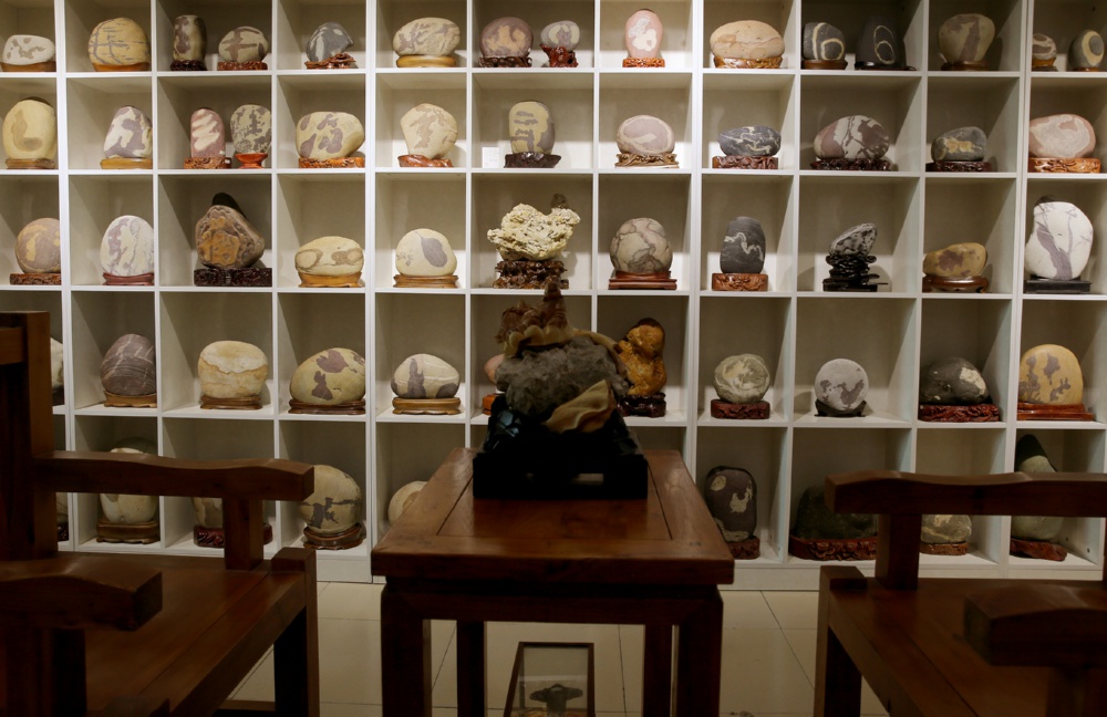 在蜀茗奇石苑的二楼,摆满了赵玉龙收藏的奇石。在给记者介绍时,他温柔地抚摸这些藏石,给我们讲述每一块石头的来历,为我们介绍每一块的画面。当他拿起藏石时,眼里都是满满的欣赏和爱惜。在收藏的同时,他还像对待孩子一样,为每一块石头起好名字,配好底座。