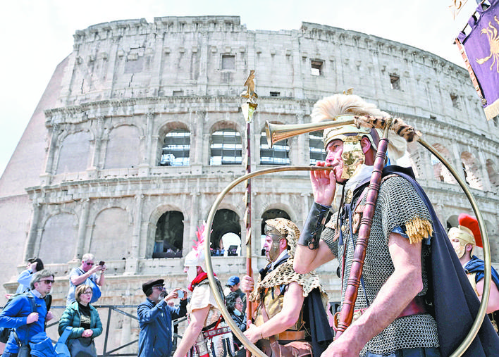 4月23日,人们在意大利罗马参加庆祝游行。 当日,人们穿戴古罗马时期服饰,围绕罗马大竞技场、威尼斯广场和斗兽场等景点进行建城2776年庆祝游行。相传罗马建城日为公元前753年4月21日。