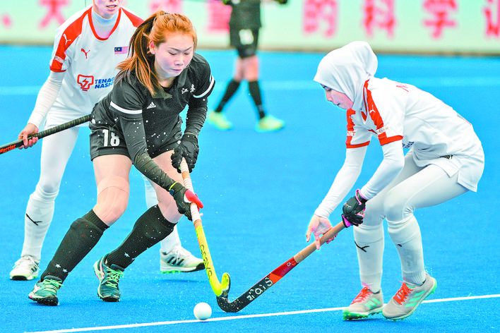 4月23日,江苏队球员刘华(左)在比赛中拼抢。 当日,在江苏省常州市举行的“两湖创新杯”首届女子曲棍球国际邀请赛第六轮比赛中,江苏省女子曲棍球队以3比1战胜马来西亚女子国家队。 新华社发(史康 摄)
